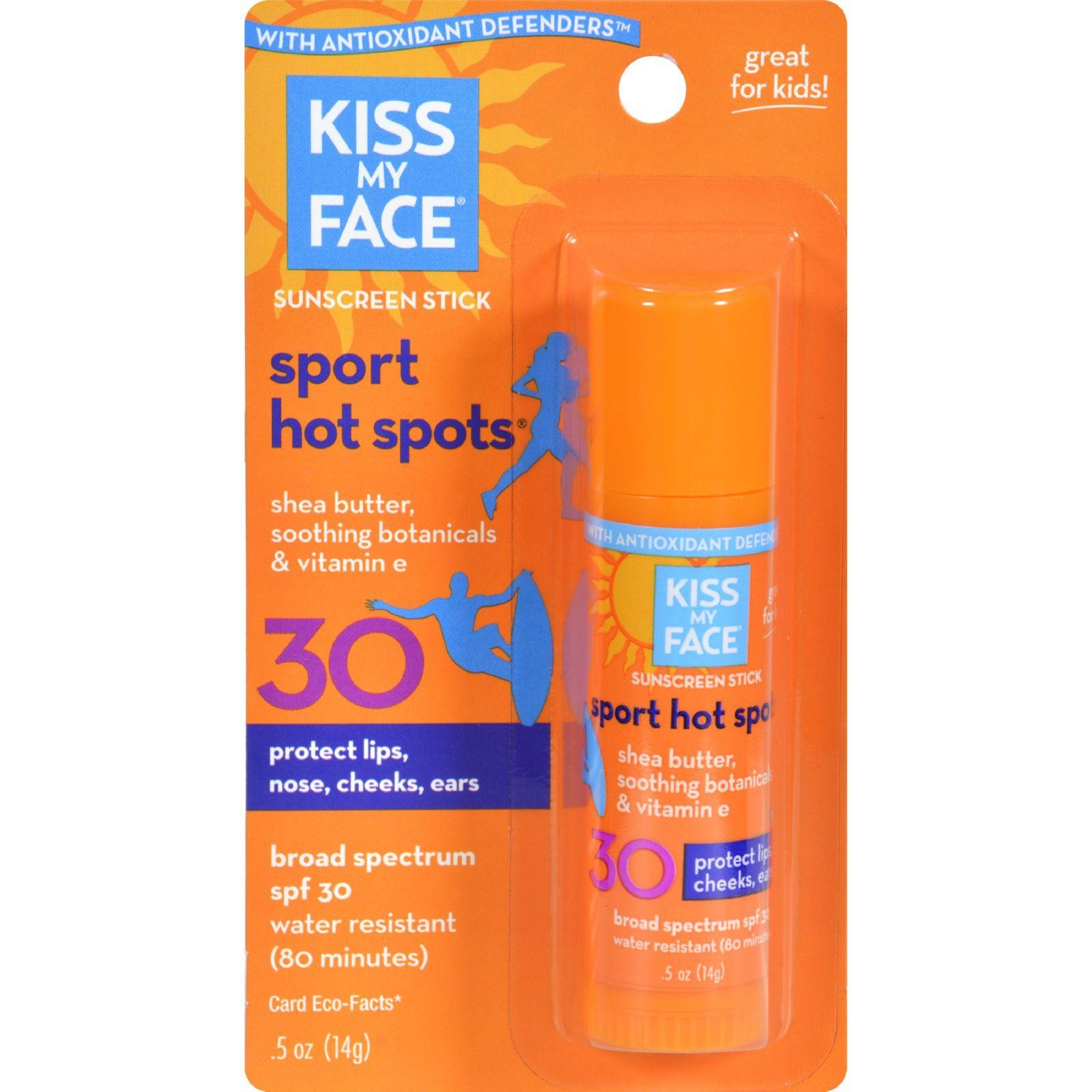 Kiss My Face Sun Care HotSpots SPF 30 Description: Hot Spots Lips Nose Cheeks Ears UVA UVB Protection Paraben Free Water Resistant Organic Beeswax Organic Oils Organic Aloe Vera Hot Spots is the effortless way to apply extra protection for those body parts that are most often exposed to the sun. Your lips, nose, cheeks and ears will thank you for the moisturizing benefits of organic bees wax, organic aloe vera, organic oils and wild crafted shea butter. With SPF 30 for UVA and UVB protection and water resistant, Hot Spots is the only choice for everything you do under the sun. Uses: Helps prevent sunburn Higher SPF gives more sunburn protection Retains SPF after 40 minutes of activity in the water. Free Of Parabens, preservatives, artificial color and animal testing. Disclaimer These statements have not been evaluated by the FDA. These products are not intended to diagnose, treat, cure, or prevent any disease.