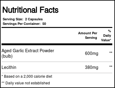 Notas: A source of Kyolic Aged Garlic Extract and Lecithin to help normalize sterol and lipid metabolism. Contains no artificial preservatives, colours, flavours or added sugar, starch, milk products, sodium, wheat or yeast.