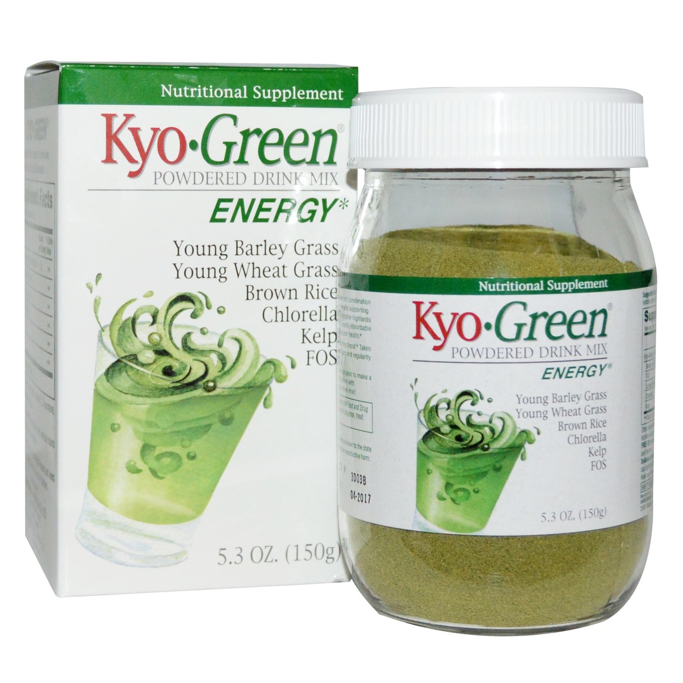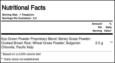 ; Organically grown barley grass and wheat grass, Pacific kelp, brown rice, and the treasured green algae, broken cell wall chlorella.