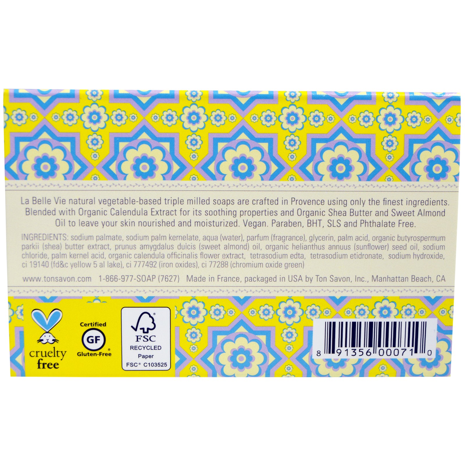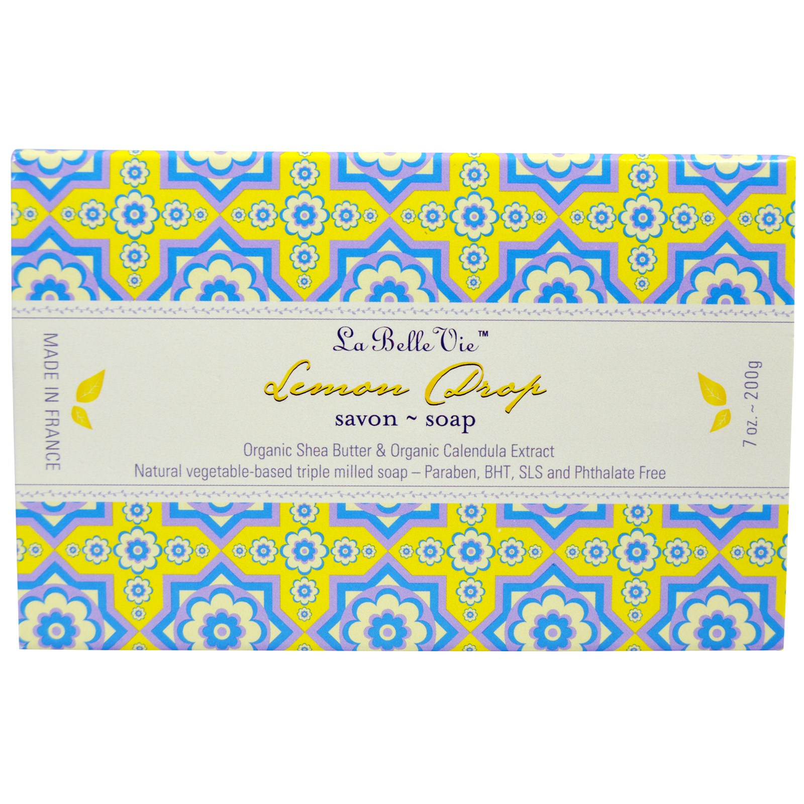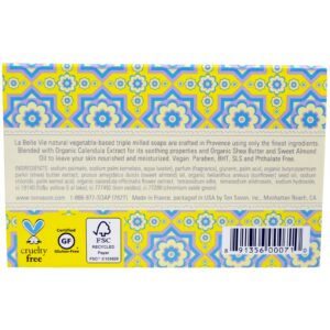 La Belle Vie natural vegetable-based triple milled soaps are crafted in Provence using only the finest ingredients. Blended with Organic Calendula Extract for its soothing properties and Organic Shea Butter and Sweet Almond Oil to leave your skin nourished and moisturized.