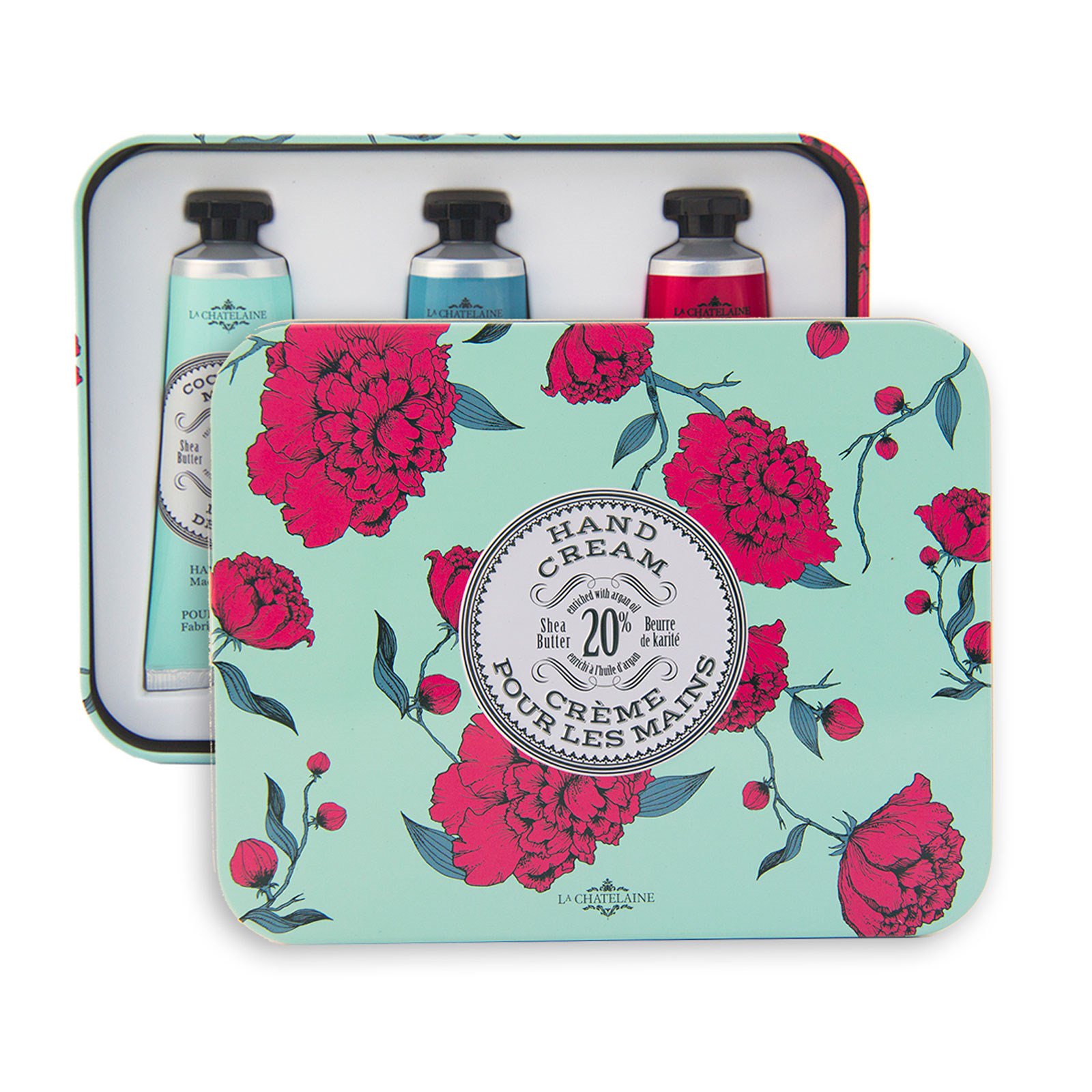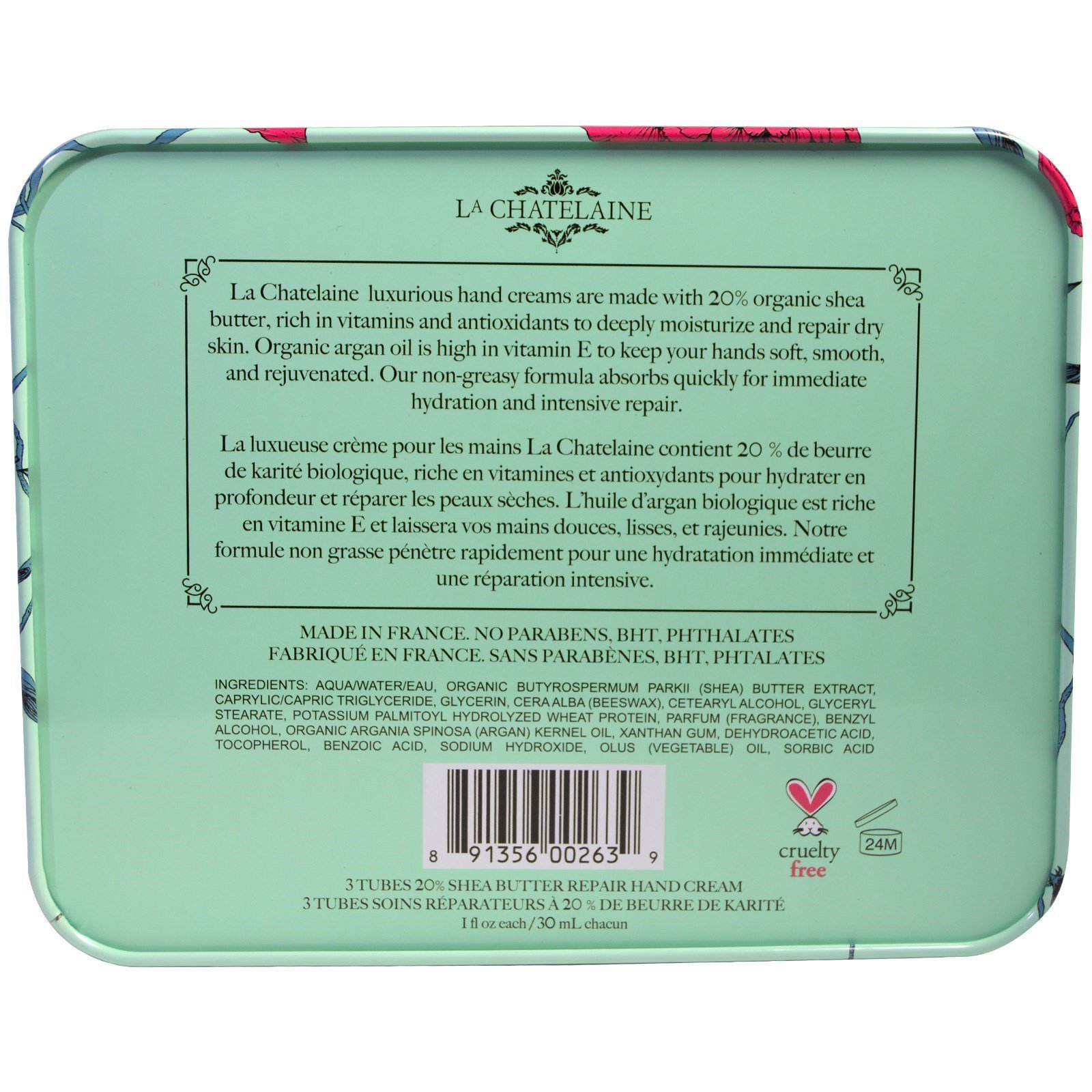 La Chatelaine luxurious hand creams are made with 20% organic shea butter, rich in vitamins and antioxidants to deeply moisturize and repair dry skin. Organic argan oil is high in vitamin E to keep your hands soft, smooth, and rejuvenated. Our non-greasy formula absorbs quickly for immediate hydration and intensive repair.