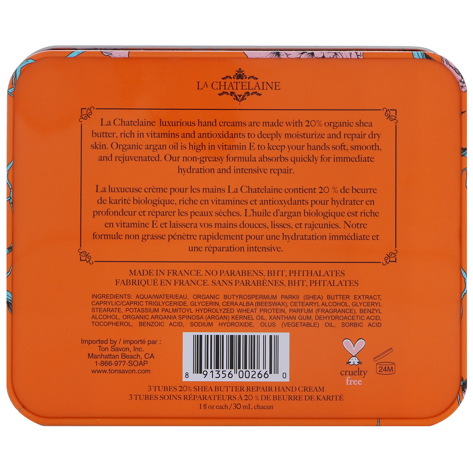 Os cremes para as mãos luxuosos da La Chatelaine são feitos com manteiga de karité 20% orgânica, rica em vitaminas e antioxidantes para hidratar profundamente e reparar a pele seca. O óleo de argan é rico em vitamina E para manter suas mãos macias, suaves e rejuvenescidas. Nossa fórmula não-oleosa absorve rapidamente para hidratação imediata e reparo intensivo.