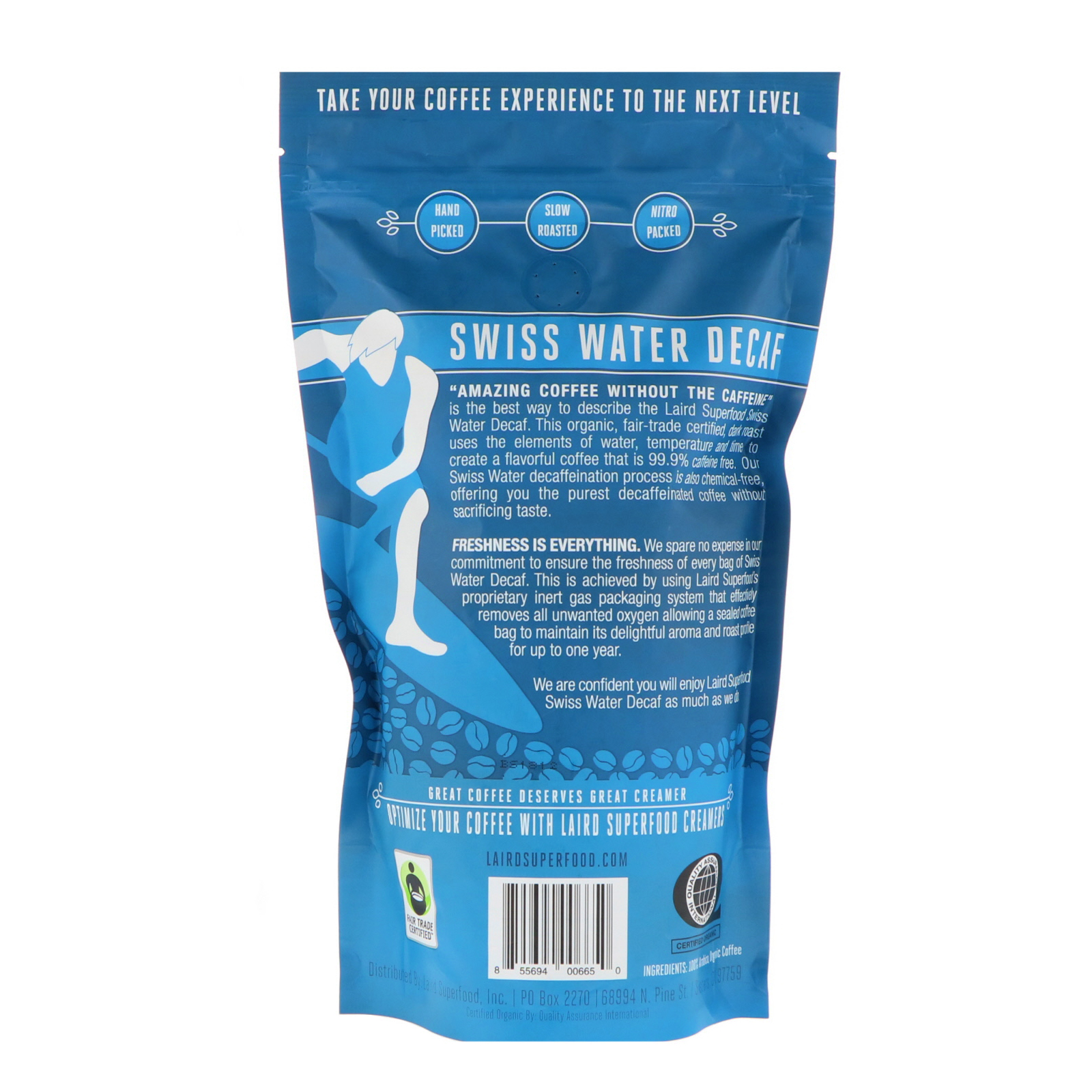 Freshness is everything. We spare no expense in our commitment to ensure the freshness of every bag of Swiss Water Decaf. This is achieved by using Laird Superfood’s proprietary inert gas packaging system that effectively removes all unwanted oxygen allowing a sealed coffee bag to maintain its delightful aroma and roast profile for up to one year.