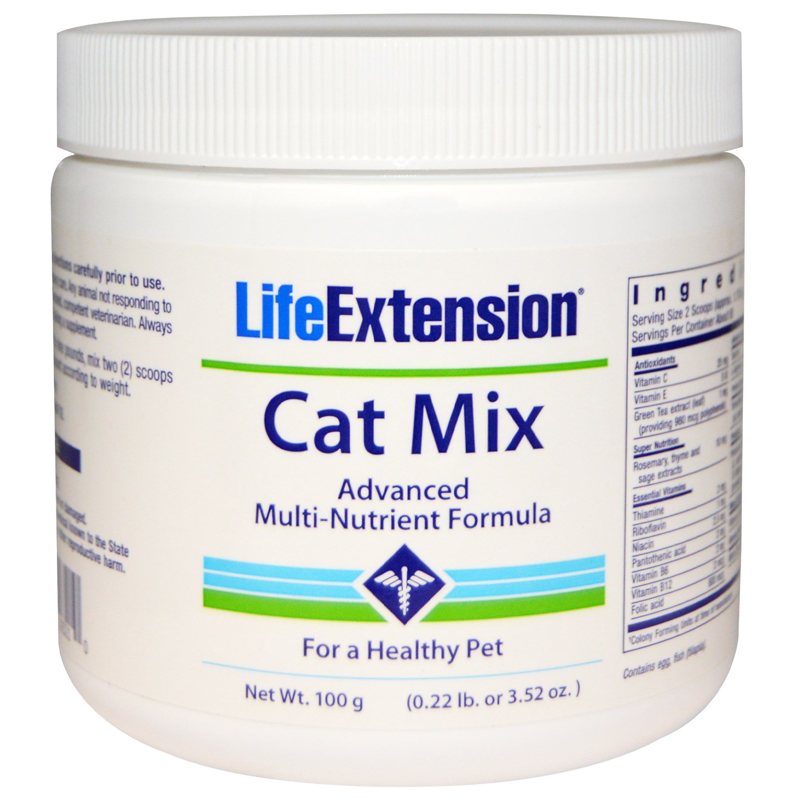 Cat Mix de Life Extension está entre os melhores produtos para proteger a saúde do seu animal de estimação. Apenas duas medidas por dia fornecem as vitaminas que seu animal de estimação precisa para se manter saudável e forte. Cat Mix contém quantidades significativas de nutrientes de alta qualidade, geralmente reservados para os mais caros suplementos para humanos. Ele contém flavonóides, aminoácidos, antioxidantes, probióticos, ácidos graxos essenciais, potencializadores de metilação e muito mais.