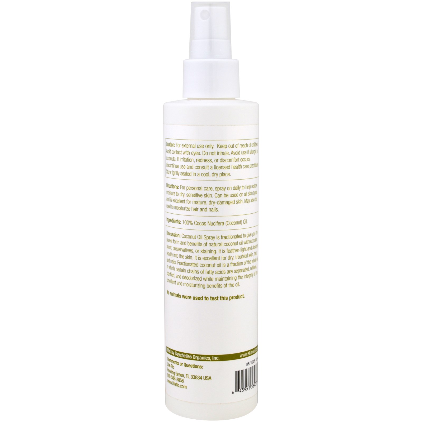 Discussion: Coconut Oil Spray is fractionated to give you the purest form and benefits of natural coconut oil without color, scent, preservatives, or staining. It is feather-light and absorbs readily into the skin. It is excellent for dry, troubled skin, hair, and nails. Fractionated coconut oil is a fraction of the whole oil in which certain chains of fatty acids are separated, refined, clarified, and deodorized while maintaining the integrity of the emollient and moisturizing benefits of the oil.