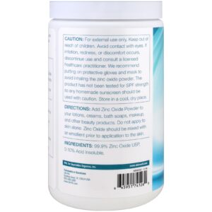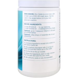 Atenção: somente para uso externo. Mantenha fora do alcance de crianças. Evite o contato com os olhos. Em caso de irritação, vermelhidão ou desconforto, interrompa o uso e consulte um profissional de saúde licenciado. Recomendamos o uso de luvas e máscara protetora para evitar a inalação do pó de óxido de zinco. Este produto não foi testado para a potência de FPS, então como qualquer protetor solar caseiro, deve ser utilizado com precaução Armazene em local seco e arejado.