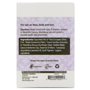 Saponified oils of *olea europaea (olive) fruit, *elaeis guineensis (palm), *cocos nucifera (coconut), & *helianthus annuus (sunflower) seed, distilled water, calcium bentonite clay, essential oil blend, *lavandula angustifolia (lavender) oil, earth pigment, *organic ingredients.