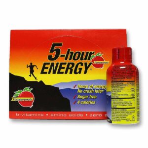 5-hour Energy contains a unique energy blend as well as several naturally energizing B vitamins such as niacin, folic acid and vitamins B6 and B12. 5-hour Energy from Living Essentials will maximize your energy in just minutes after drinking and will stay in your system fou up to five hours. Increase what you’re capable of without wourying about the crash later on.
