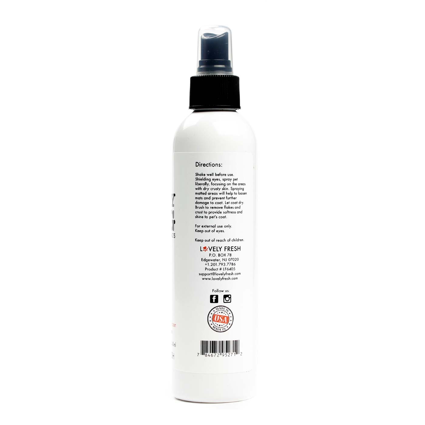RECOMMENDED USE: Shake well befoue use. Shielding eyes, spray pet liberally, focusing on the areas with dry crusty skin. Spraying matted areas will help to loosen mats and prevent further damage to coat. Let coat dry. Brush to remove flakes and crust to provide softness and shine to pet’s coat.