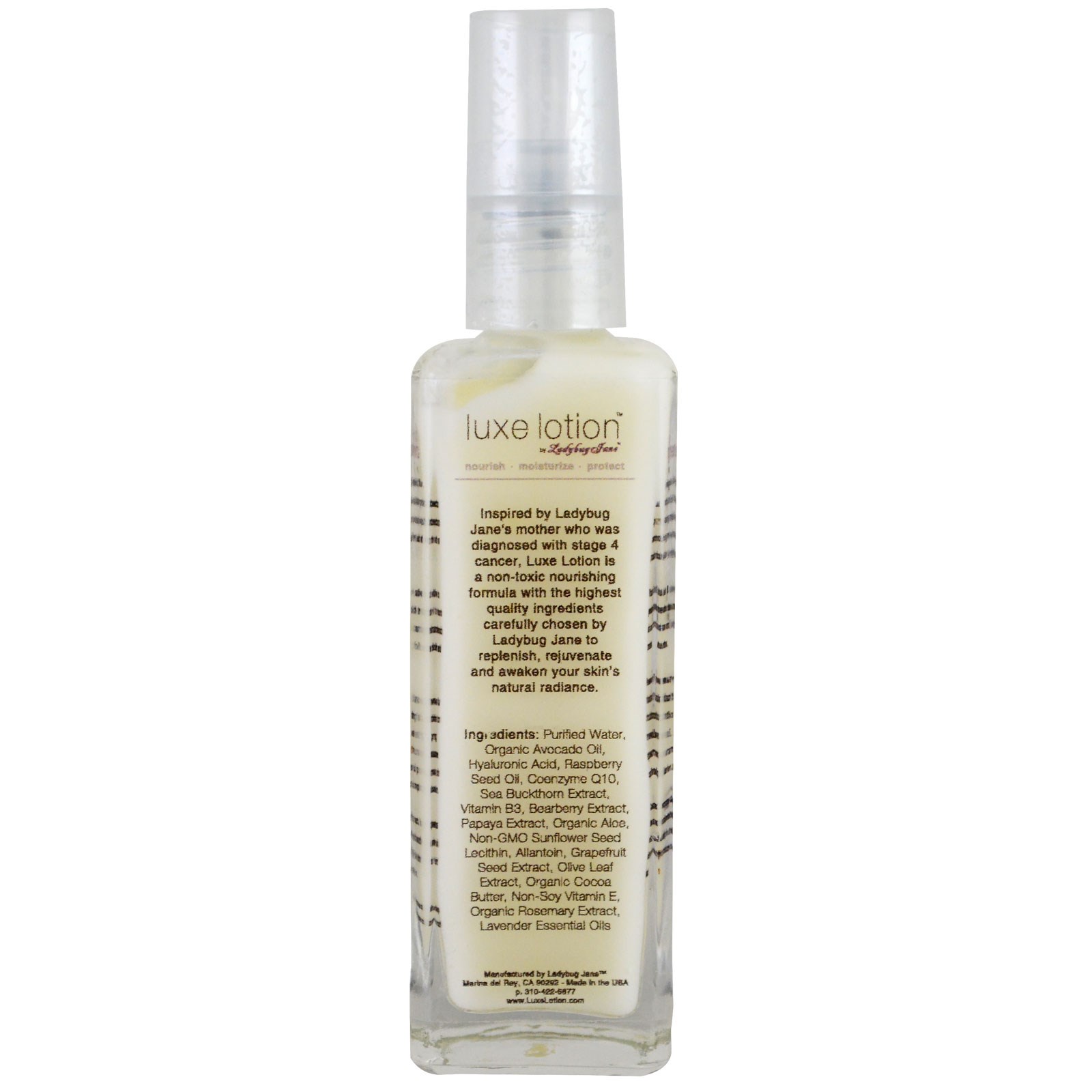 Inspired by Ladybug Jane’s mother who was diagnosed with stage 4 cancer, Luxe Lotion is a non-toxic nourishing formula with the highest quality ingredients carefully chosen by Ladybug Jane to replenish, rejuvenate and awaken your skin’s natural radiance.