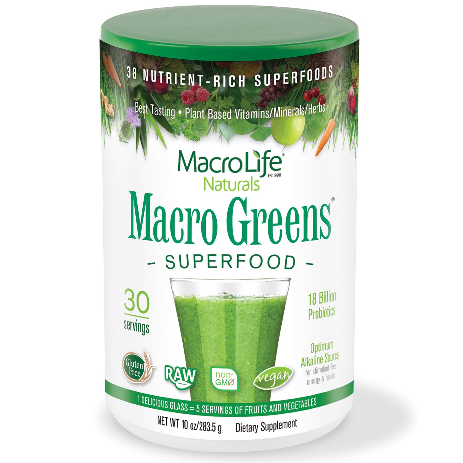 Macro Greens nutre seu corpo de dentro para fora; com antioxidantes, enzimas, vitaminas, minerais, aminoácidos, 18 bilhões de probióticos, além de uma mistura herbácea que colabora com múltiplos sistemas. Curta a energia sem estimulantes de alimentos vegetais integrais, que desintoxicam gentilmente, colaborando com um peso saudável. Este delicioso pó alcalinizante se mistura ou combina facilmente e remove as dúvidas sobre suplementação diária.
