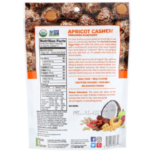 Organic apricots, organic raisins (organic raisins, organic sunflower oil), organic cashews, organic cashew almond butter (organic cashews, organic almonds, organic gluten-free oat fiber, organic sunflower oil), organic pepita seeds, organic cranberries (organic cranberries, organic apple juice concentrate, organic sunflower oil), organic dates, organic sunflower seeds, organic coconut oil, organic figs, organic coconut, organic cinnamon, sea salt.