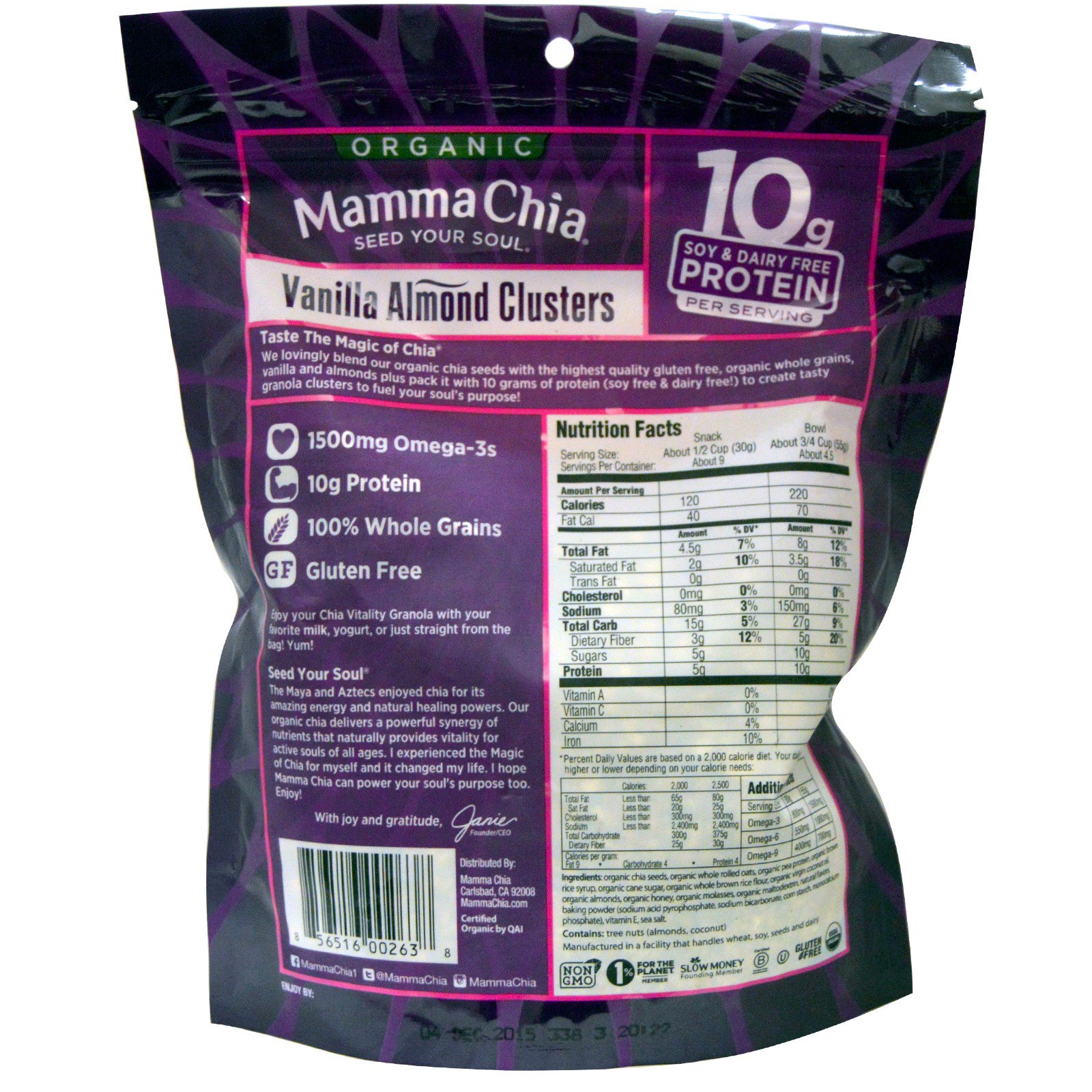 Nós misturamos amorosamente nossas sementes de chia orgânica com grãos integrais sem glúten da mais alta qualidade, baunilha e amêndoas, além de adicionar 10 gramas de proteína (livre de soja e laticínios!) para criar bombons de granola saborosos para abastecer sua alma!