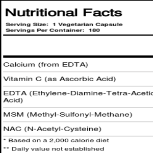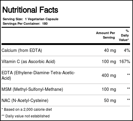 Notas: • EDTA – FDA approval in food supply for 50 years • EDTA – FDA approved use in heavy metal poisoning • Benefit in detoxification, arterial and venous support • Normalizes metal balances within the body Contains no common allergens