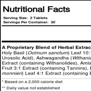 The herbal blend in Exhilarin by Metagenics is formulated with a proprietary mix of extracts including holy basil leaf, amla fruit and others.