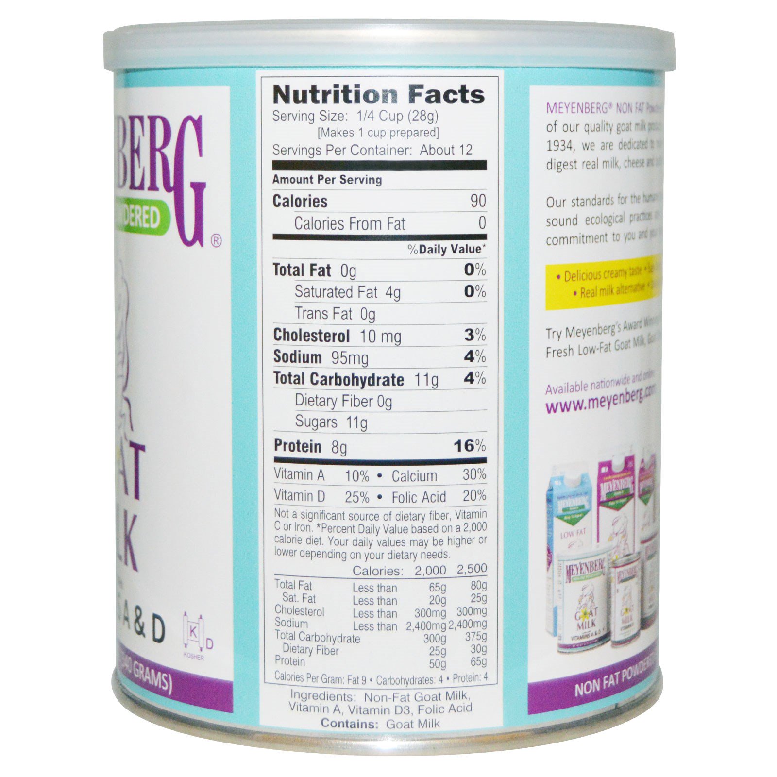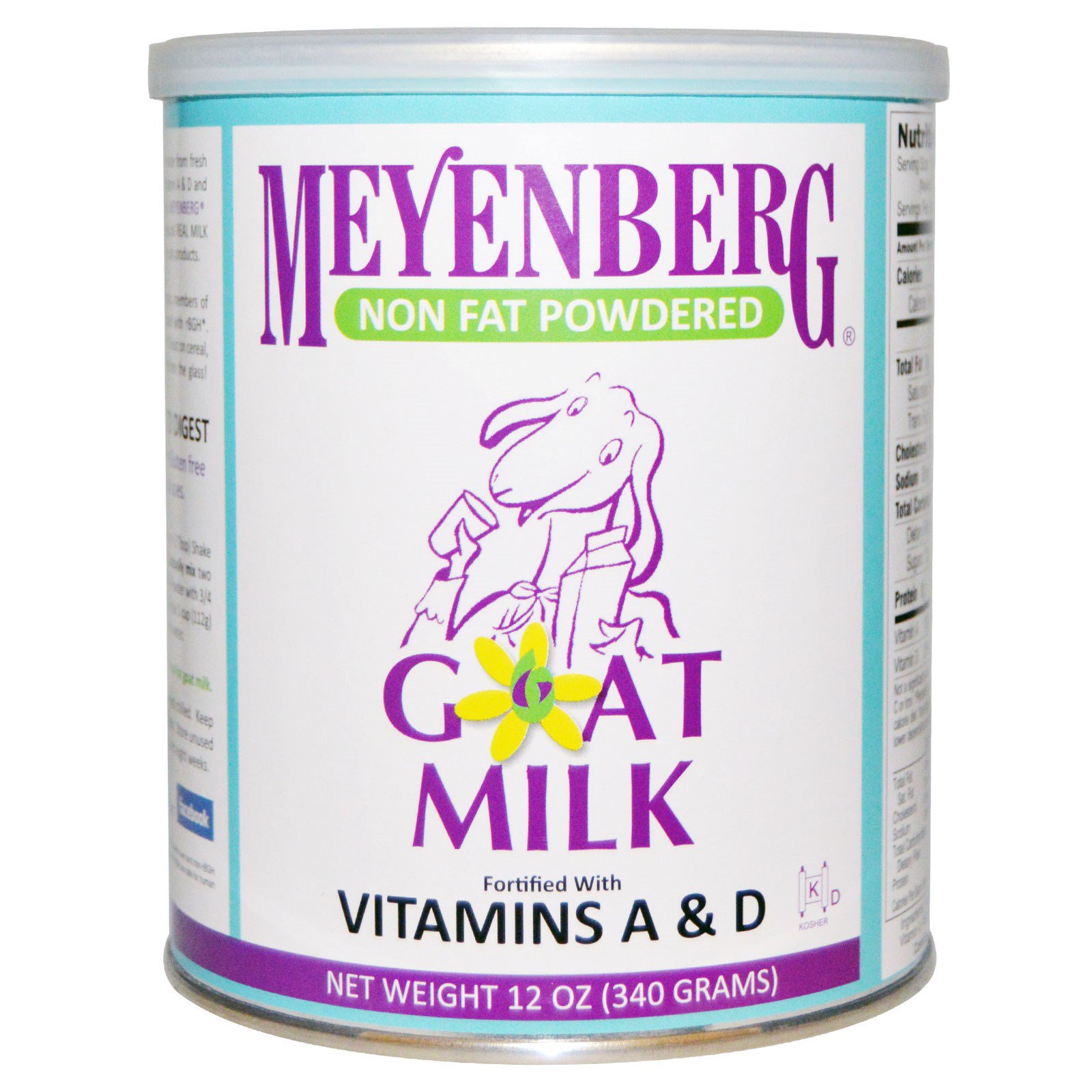 O Leite de Cabra em Pó Sem Gordura Meyenberg é feito de leite de cabra fresquinho, do Tipo A e pasteurizado. Fortificado com Vitaminas A & D e suplementado com ácido fólico, é uma conveniência. Há gerações, os Produtos de Leite de Cabra Meyenberg tem sido uma alternativa conveniente e natural para aqueles que são sensíveis ao leite de vaca e/ou produtos de soja.