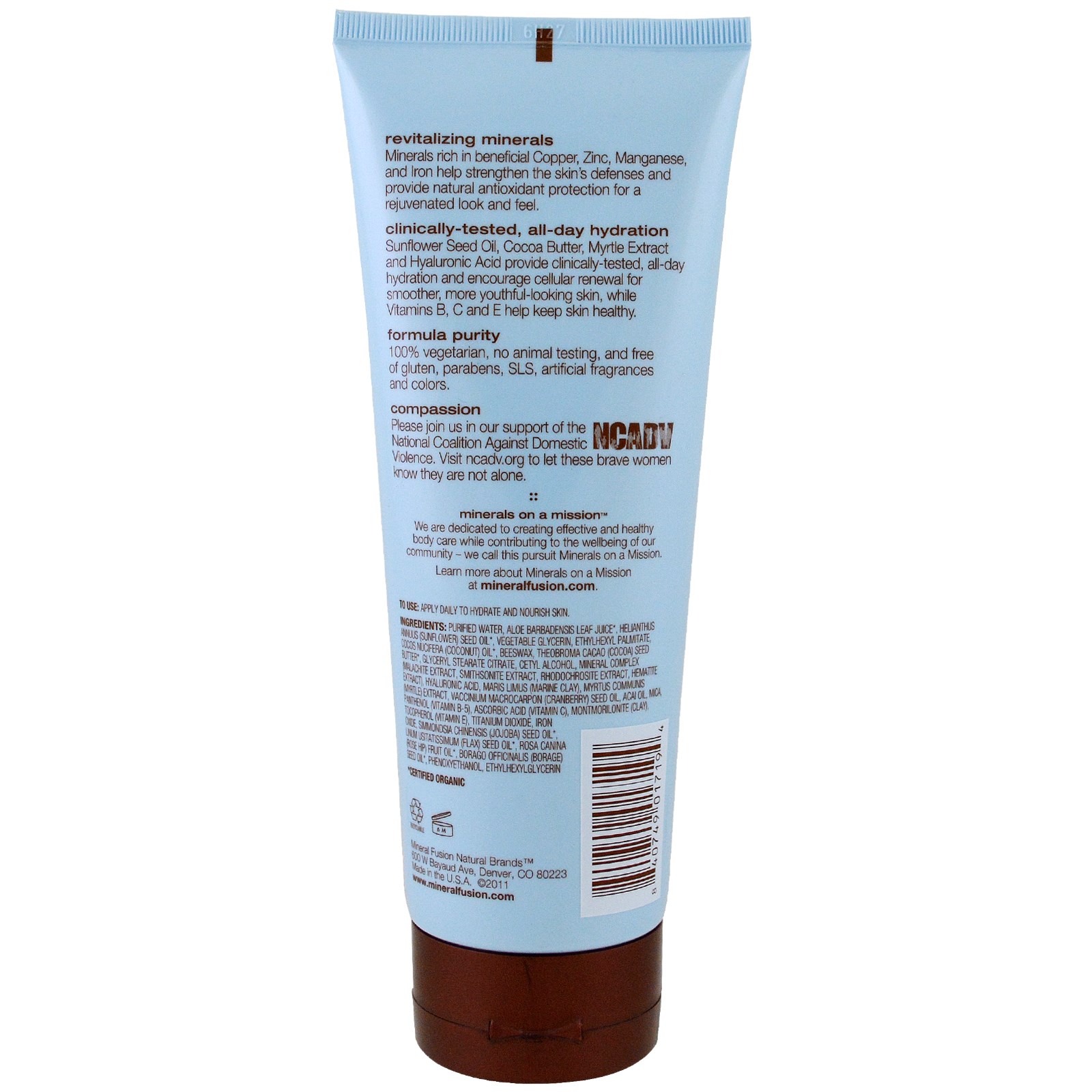 Água purificada, suco de folha de aloe barbdensis *, óleo de semente de helianthus annuus (girassol) *, palmitato de etilhexilo de glicerina vegetal, óleo de cocos nucifera *, cera de abelha, manteiga de semente de theobroma cacao (cacau) *, citrato de estearato de glicerilo, (Extrato de malaquita, extrato de smithsonita, extrato de rodocrosita, extrato de hematite), ácido hialurônico, maris limus (argila marinha), extrato de myrtus communis, óleo de semente de vaccinium macrocarpo (cranberry), óleo de açaí, mica pantenol (vitamina B-5 ), Ácido ascórbico (vitamina C), montimorilonite (argila) tocoferol (vitamina E), dióxido de titânio, óxido de ferro, óleo de semente de simmondsia chinensis (jojoba) *, linum usitatissimum (linho) Óleo *, borago officinalis (borragem) óleo de semente *, fenoxietanol, etihexilglicerina