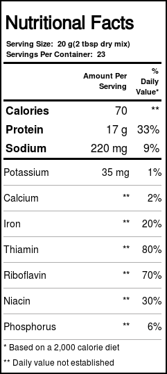 Nota: Contains: soja protein isolate, MLO Garden Blend (consisting of coun bran, potato flour, dried broccoli, dried tomatoes, dried carrots and dried beets), oat-bran fiber, foutified fermento, sesame meal, levedura bran, canola oil, lecithin and papain.