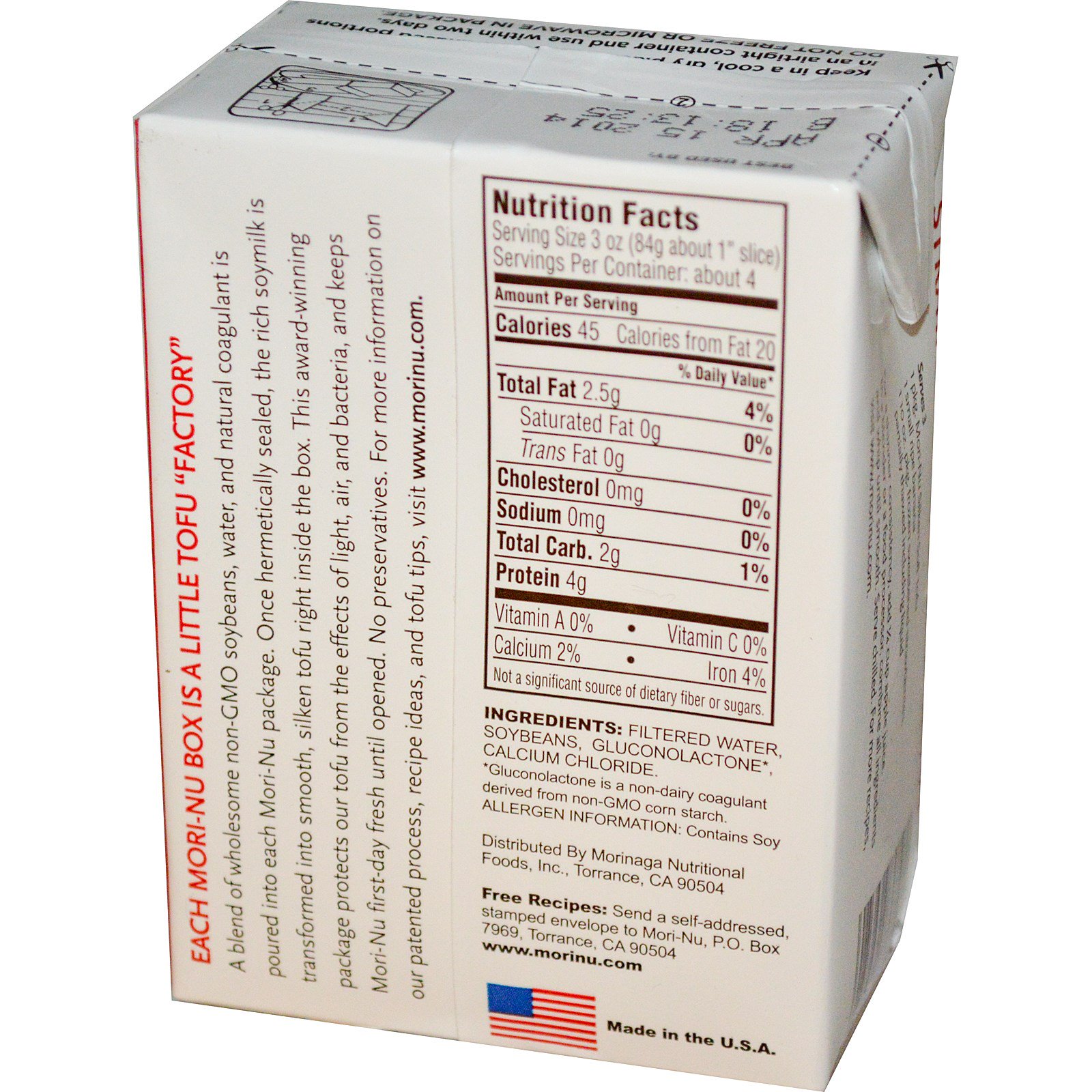 A blend of wholesome non-GMO soybeans, water, and natural coagulant is poured into each Mori-Nu package. Once hermetically sealed, the rich soymilk is transformed into smooth, silken tofu right inside the box. This award-winning package protects our tofu from the effects of light, air, and bacteria, and keeps Mori-Nu first-day fresh until opened. No preservatives.