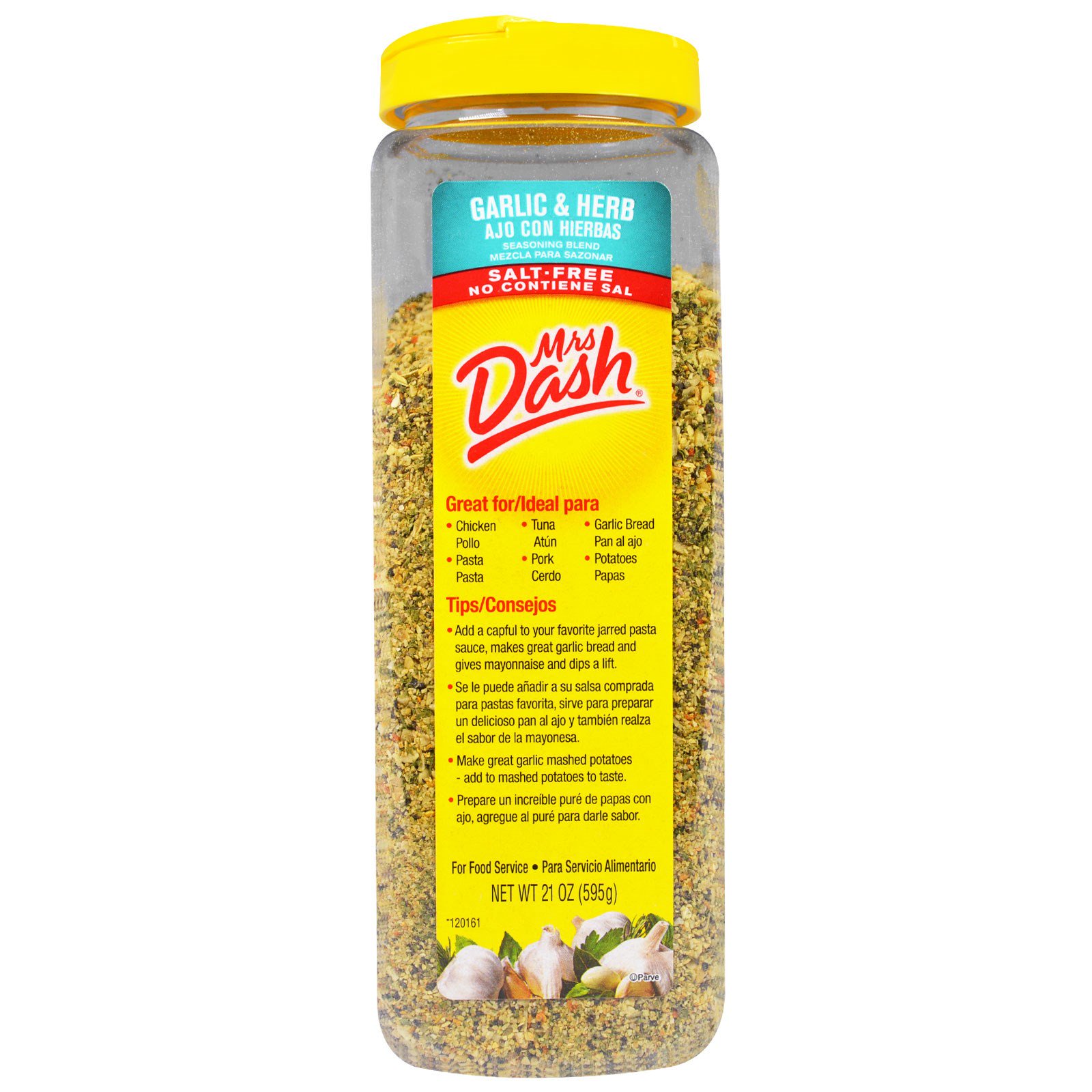 Alho e Ervas da Mrs. Dash: Uma saborosa mistura de alho com ervas e especiarias, incluindo orégano, salsa e pimenta-do-reino recém-moída, que dá um sabor animado a aves, carnes, macarrão ou pães.