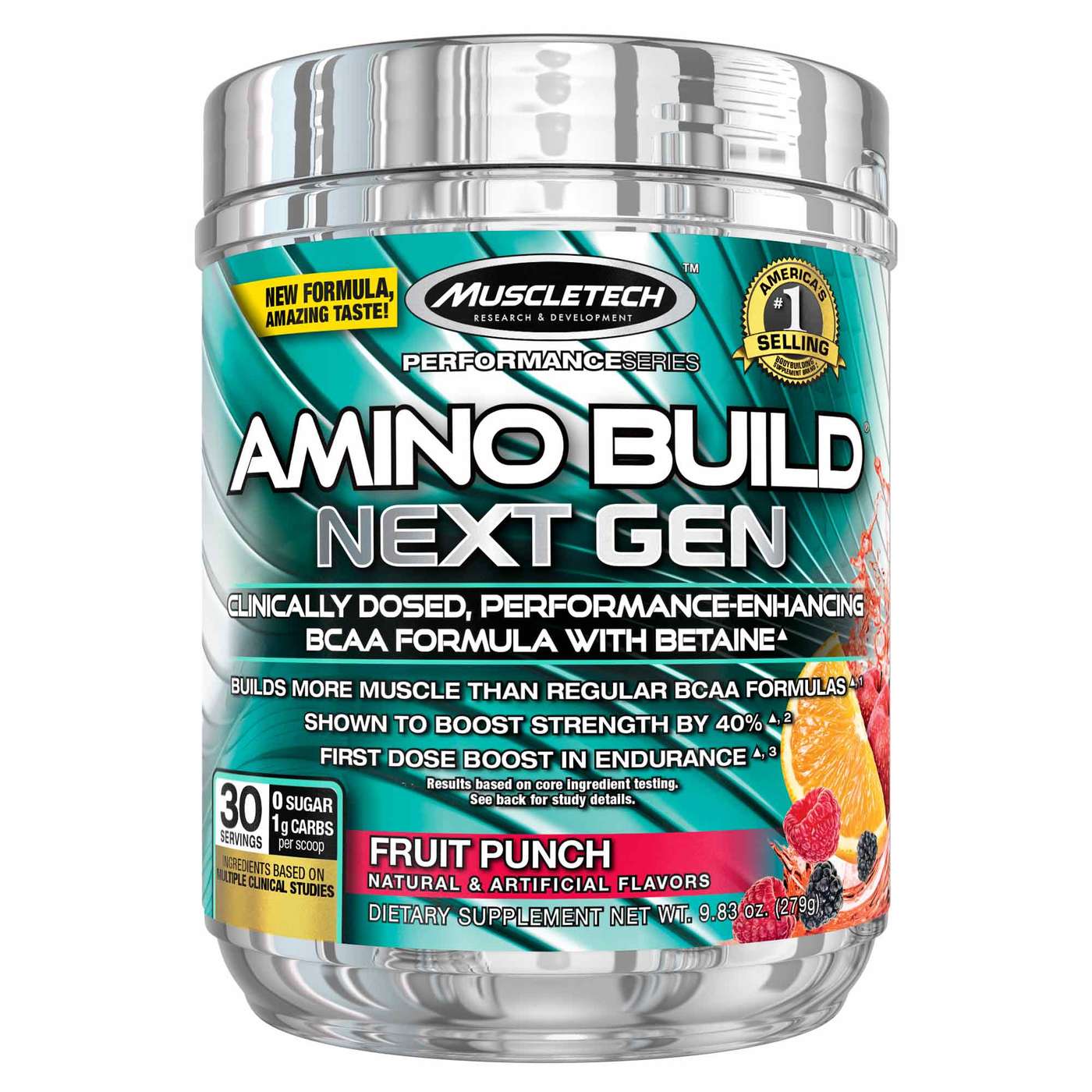 MuscleTech Amino Build é uma fórmula de BCAA que possui um ótimo sabou e auxilia na melhoua do desempenho.