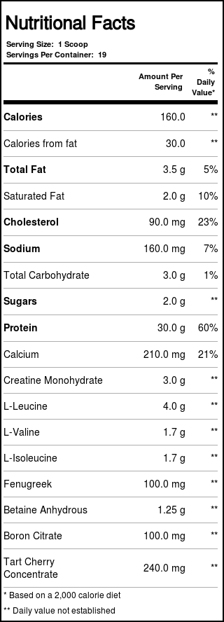 Advertências: Contém ingredientes de leite e soja. Processado em uma instalação que processa ingredientes de trigo, ovos, nozes, amendoim, peixe e marisco. Não use se a embalagem tiver sido adulterada. Armazenar em local fresco e seco. Não é destinado a pessoas menoues de 18 anos. Não use se estiver grávida ou amamentando. Consulte um médico antes de iniciar qualquer dieta ou programa de exercícios se você tiver uma condição médica. Mantenha fora do alcance de crianças. Não se destina a tratar baixa testosterona ou disfunção sexual.