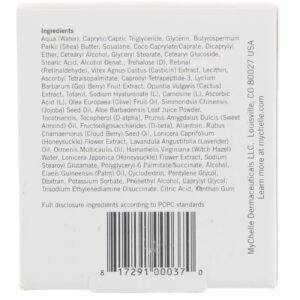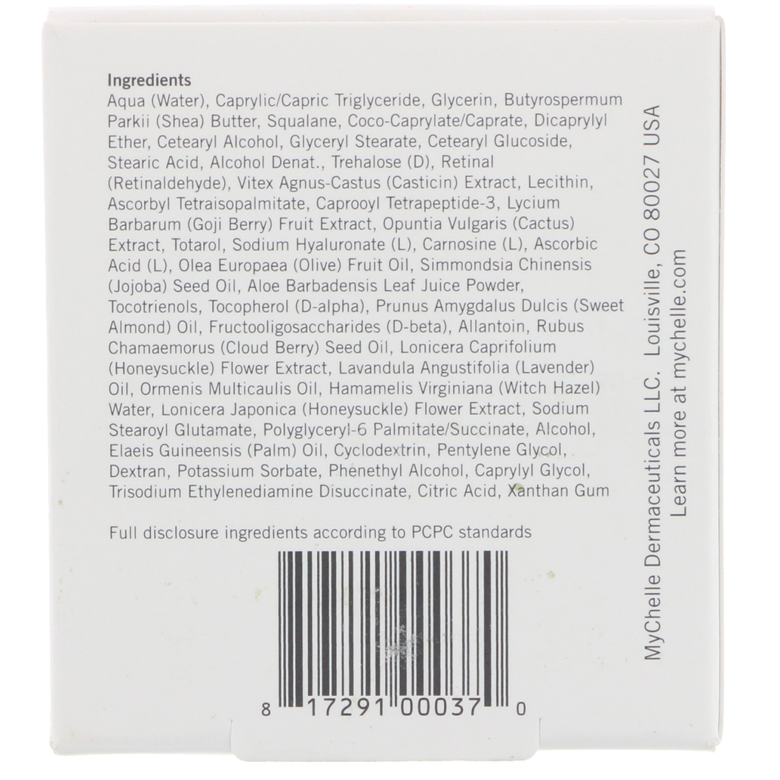 Aqua (water), caprylic/capric triglyceride, glycerin, butyrospermum parkii (shea) butter, squalane, coco-caprylate/caprate, dicaprylyl ether, cetearyl alcohol, glyceryl stearate, cetearyl glucoside, stearic acid, alcohol denat., trehalose (D), retinal (retinaldehyde), vitex agnus-castus (casticin) extract, lecithin, ascorbyl tetraisopalmitate, caprooyl tetrapeptide-3, lycium barbarum (goji berry) fruit extract, opuntia vulgaris (cactus) extract, totarol, sodium hyaluronate (L), carnosine (L), ascorbic acid (L), olea europaea (olive) fruit oil, simmondsia chinensis (jojoba) seed oil, aloe barbadensis leaf juice powder, tocotrienols, tocopherol (d-alpha), prunus amygdalus dulcis (sweet almond) oil, fructooligosaccharides (d-beta), allantoin, rubus chamaemorus (cloud berry) seed oil, lonicera caprifolium (honeysuckle) flower extract, lavandula angustifolia (lavender) oil, ormenis multicaulis oil, hamamelis virginiana (witch hazel) water, lonicera japonica (honeysuckle) flower extract, sodium stearoyl glutamate, polyglyceryl-6 palmitate/succinate, alcohol, elaeis guineensis (palm) oil, cyclodextrin, pentylene glycol, dextran, potassium sorbate, phenethyl alcohol, caprylyl glycol, trisodium ethylenediamine disuccinate, citric acid, xanthan gum.