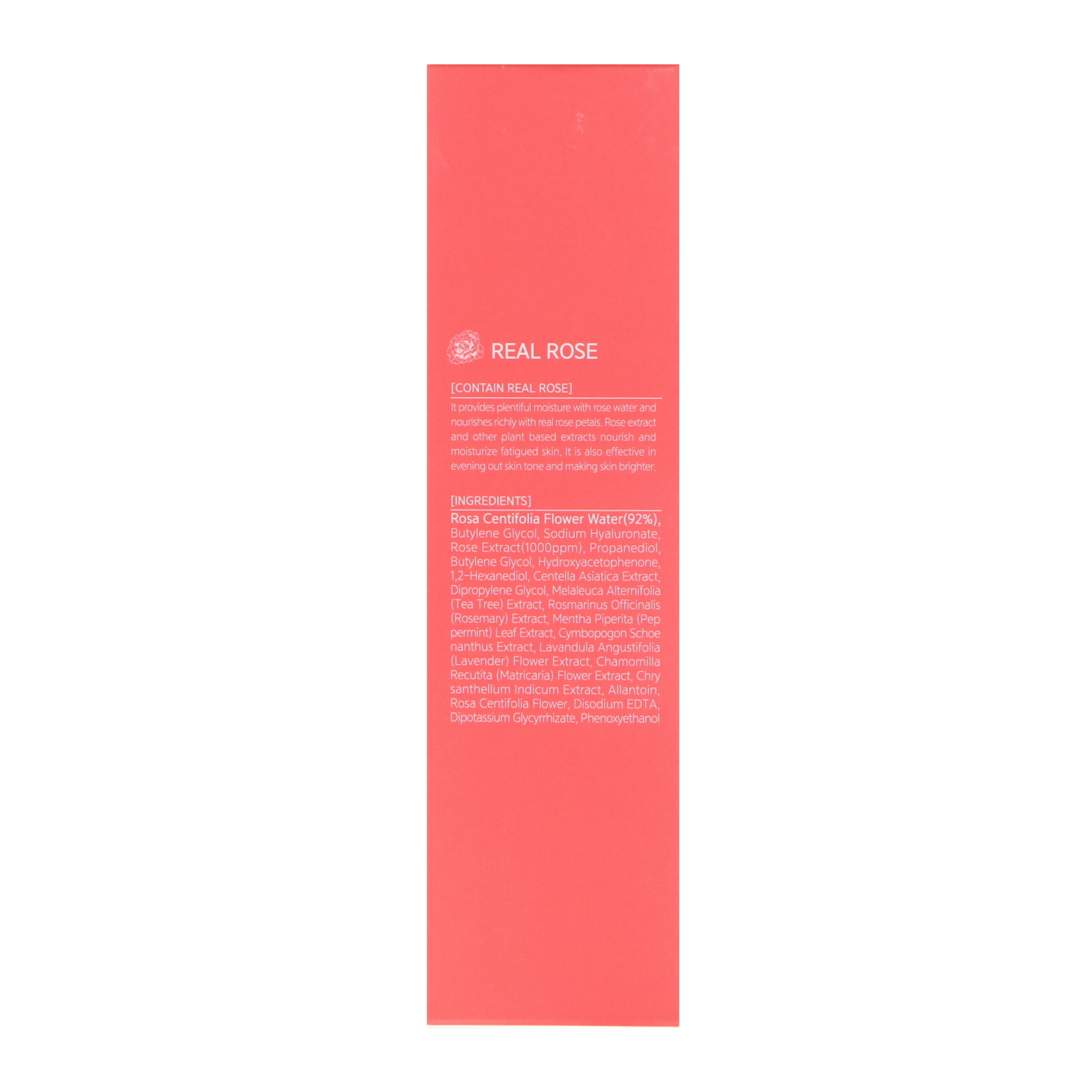 Rosa centifolia flower water (92%), butylene glycol, sodium hyaluronate, rose extract (1000 ppm), propanediol, butylene glycol, hydroxyacetophenone, 1,2-hexanediol, centella asiatica extract, dipropylene glycol, melaleuca alternifolia (tea tree) extract, rosmarinus officinalis (rosemary) extract, mentha piperita (peppermint) leaf extract, cymbopogon schoenanthus extract, lavandula angustifolia (lavender) flower extract, chamomilla recutita (matricaria) flower extract, chrysanthellum indicum extract, allantoin, rosa centifolia flower, disodium edta, dipotassium glycyrrhizate, phenoxyethanol.