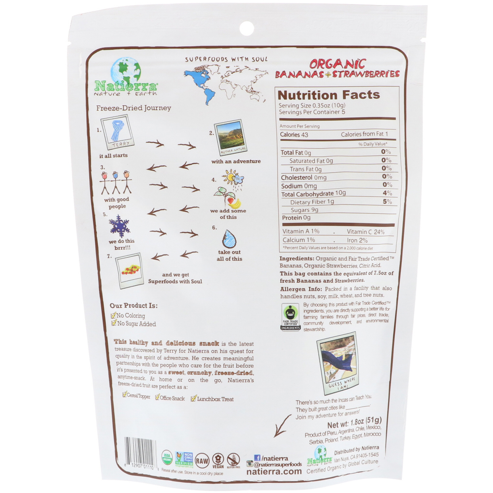 This healthy and delicious snack is the latest treasure discovered by Terry for Natierra on his quest for quality in the spirit of adventure. He creates meaningful partnership with people who care for the fruit before it’s presented to you as a sweet, crunchy, freeze-dried, anytime-snack. At home or on the go, Natierra’s freeze-dried fruit are perfect as a: