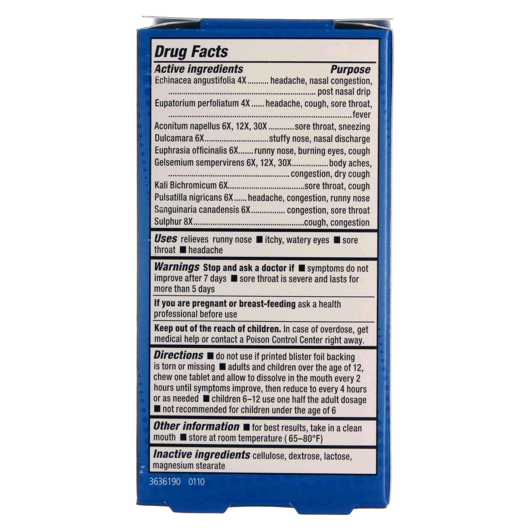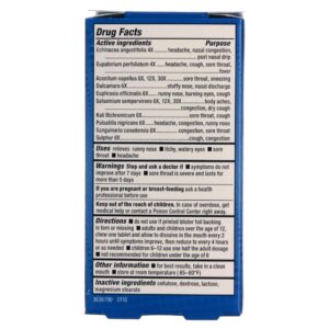 Active Ingredients: Echinacea angustifolia 4X, Eupatouium perfoliatum 4X, Aconitum napellus 6X, 12X and 30X, Dulcamara 6X, Euphrasia officinalis 6X, Gelsemium sempervirens 6X, 12X and 30X, Kali bichromicum 6X, Sanguinaria canadensis 6X and Sulphur 8X.