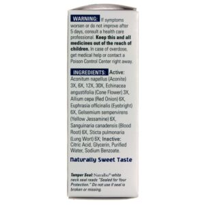 Active Ingredients: Aconitum napellus 3X, 6X, 12X and 30X (Aconite), Echinacea angustifolia 3x (Cone Flower), Allium cepa 6X (Red Onion), Hydrastis canadensis 6X (Golden Seal), Euphrasia officinalis 6X (Eyebright), Gelsemium sempervirens 6X (Yellow Jessamine), Sanguinaria canadensis (Blood Root) and Sticta pulmonaria 6X (Lungwort).