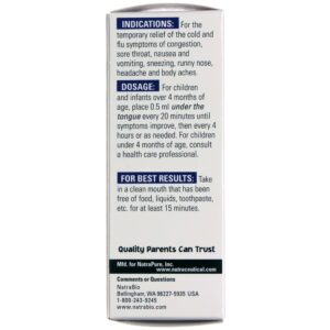 Directions: Children and infants over four months of age, place 0.5 mL under the tongue every 20 minutes until symptoms improve, then every four hours or as needed.