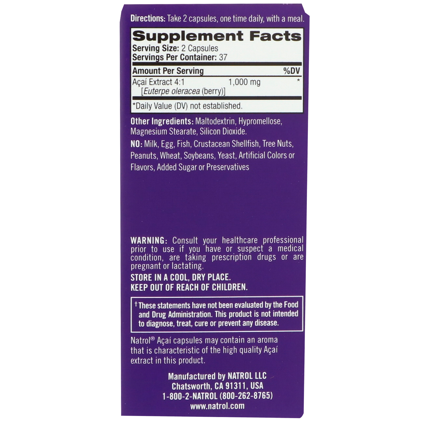 As cápsulas Natrol Acai podem conter aroma que é característico do extrato de Açaí de alta qualidade neste produto.