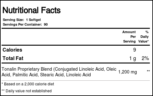 Tonalin CLA is a newly-recognized supplement derived from natural safflower oil. Years of research at the University of Wisconsin indicate that CLA may play a role in reduction of body fat and an increase in muscle tuma. Natrol’s Tonalin CLA is the only patented foum of conjugated linoleic acid.