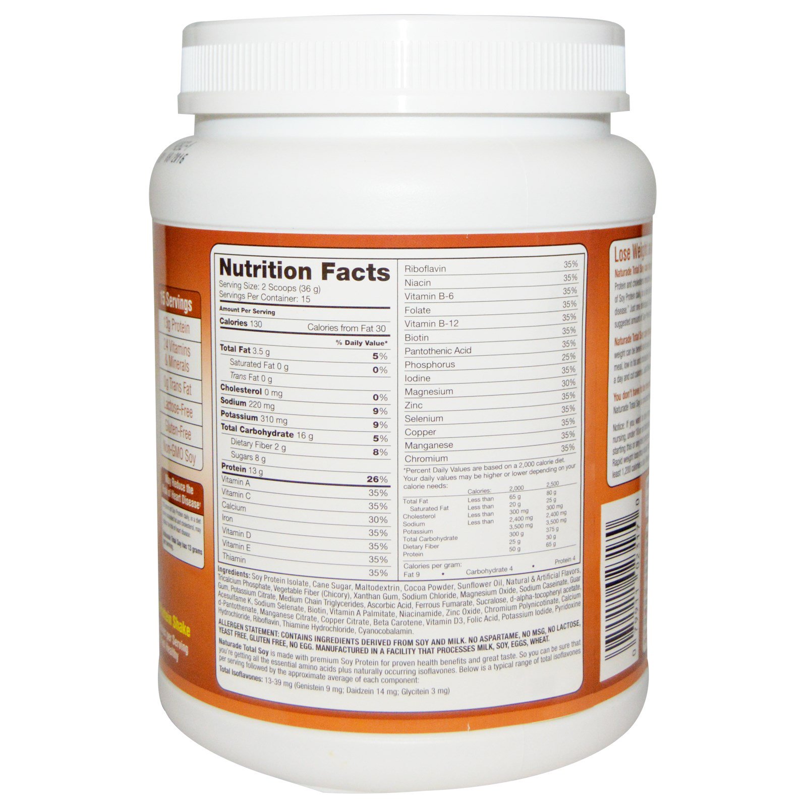 Naturade Total Soy é feito com proteína de soja premium para benefícios de saúde comprovados e excelente sabor. Então você pode ter certeza que você tem o direito de obter todos os aminoácidos essenciais e isoflavonas naturais. Abaixo está uma gama típica de total de isoflavonas por porção, seguida pela média aproximada de cada componente: