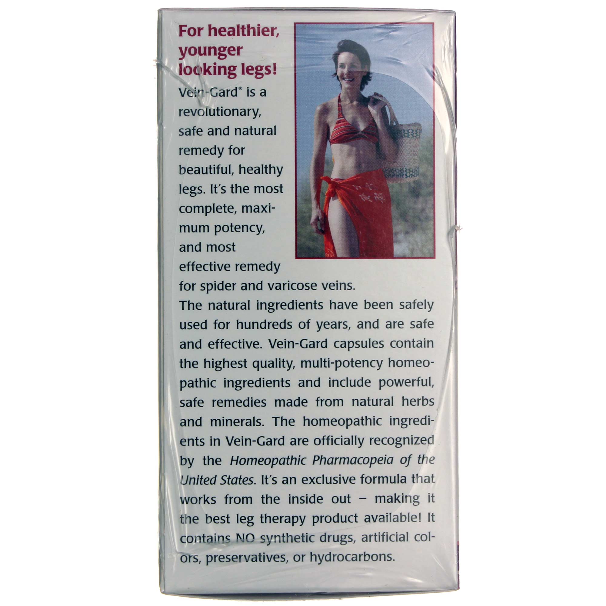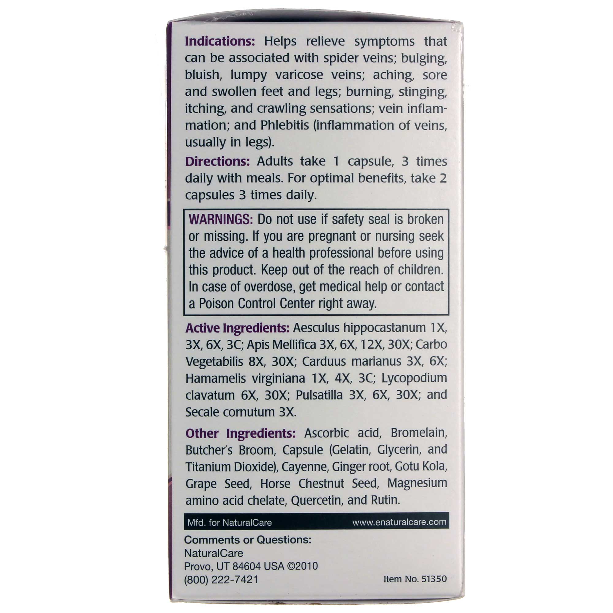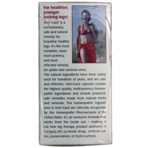 Active Ingredients: Aesculus hippocastanum 1X, 3X, 6X, 3C; Apis mellifica 3X, 6X, 12X, 30X; Carbo Vegetabilis 8X, 30X; Carduus marianus 3X, 6X; Hamamelis virginica 1X, 4X, 3C; Lycopodium clavatum 6X, 30X; Pulsatilla 3X, 6X, 30X; and Secale cornutum 3X. Other ingredients: Ascorbic acid, Bromelain, Butcher’s Broom, Capsule (Gelatin, Glycerin, and Titanium Dioxide), Cayenne, Ginger root, Gotu Kola, Grape Seed, Horse Chestnut Seed, Magnesium amino acid chelate, Quercetin, and Rutin.