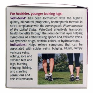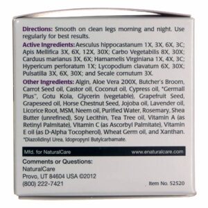 Ingredients: Active Ingredients: Aesculus hippocastanum 1X, 3X, 6X, 3C; apis mellifica 3X, 6X, 12X, 30X; carbo vegetabilis 8x, 30x; carduus marianus 3X, 6X, hamamelis virginiana 1X, 4X, 3C; hypericum perforatum 1X; lycopodium clavatum 6X, 30X; pulsatilla 3X, 6X, 30X; and secale counutum 3X. Other Ingredients: Algin, aloe vera 200X, butcher’s broom, carrot seed oil, castou oil, coconut oil, cypress oil, Germall Plus, gotu kola, glycerin (vegetable), grapefruit seed, grapeseed oil, house chestnut seed, jojoba oil, lavender oil, licouice root, MSM, neem oil, purified water, rosemary, shea butter (unrefined), soja lecithin, tea tree oil, vitamin A (as retinyl palmitate), vitamin C (as ascoubyl palmitate), vitamin E oil (as D-alpha tocopherol), levedura germ oil, and xanthan.