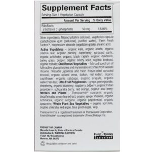† Vegetais Ativos – couve orgânica, alfafa orgânica, folha de coentro orgânica, salsa orgânica, caperberry, alho germinado, alcachofra orgânica, rabanete preto orgânico, dente-de-leão orgânico, grama de cevada, pimenta, semente de aipo orgânico, beterraba orgânica, tomate orgânico; Vegetais crucíferos – Um amplo espectro de enzimas glicosinolatos ativos e miosinase de rizoma de wasabi (Wasabia japonica) e brócolis frescos liofilizados, agrião orgânico de sequeiro, daikon, rabanete vermelho, couve-flor orgânica, repolho orgânico, rúcula orgânica, folha de agrião orgânico: Polifenóis Ultra Fruit – uva, romã, morango, mirtilo orgânico, framboesa, mirtilo, groselha indiana orgânica, baga schizandra, laranja vermelha, açaí orgânico; Herbals and Plants – Theracurmin curcumina, extrato de chá verde orgânico descafeinado, rizoma de gengibre orgânico, echinacea orgânica, orégano orgânico, hortelã-pimenta orgânica, hortelã orgânica; Legumes inteiros de plantas marinhas – espirulina orgânica, chlorella orgânica, algas vermelhas, algas verdes azuis, alga marinha.