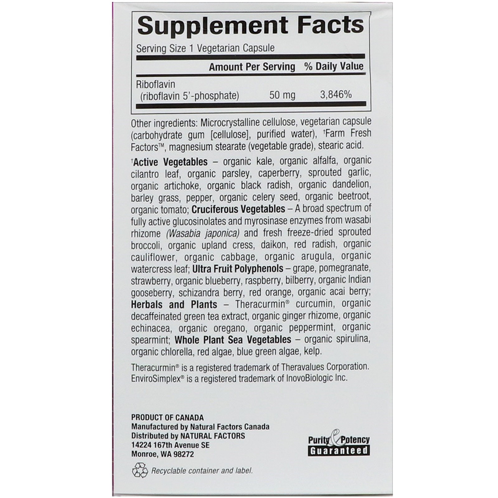 Celulose microcristalina, cápsula vegetariana (goma de carboidrato [celulose], água purificada), † fatores frescos da fazenda, estearato de magnésio (grau vegetal), ácido esteárico.