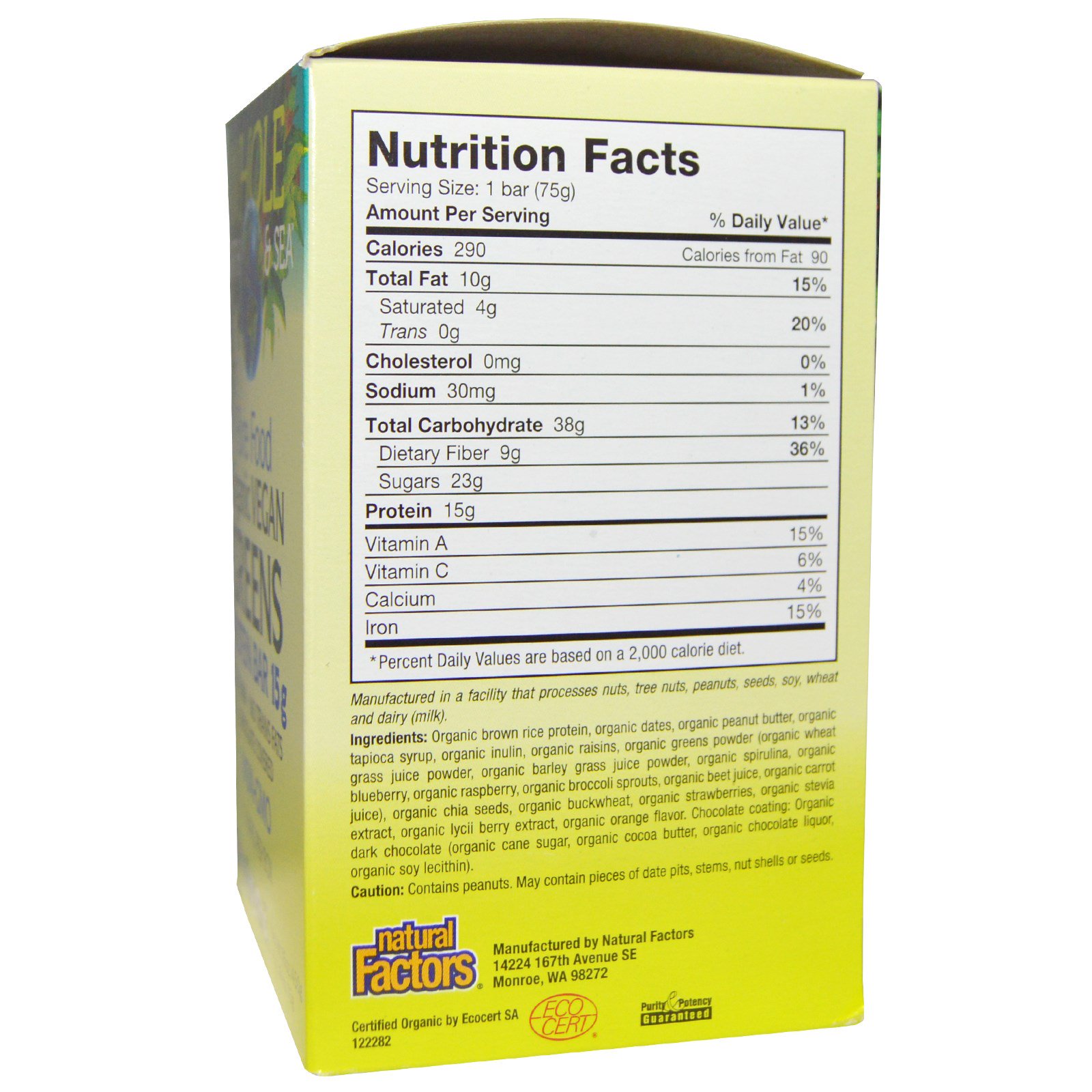 Proteína orgânica de arroz integral, datas orgânicas, manteiga de amendoim orgânica, xarope de tapioca orgânico, inulina orgânica, passas orgânicas, pó de vegetais orgânicos (pó orgânico de suco de capim de trigo, pó orgânico de suco de cevada, espirulina orgânica, mirtilos orgânicos, framboesas orgânicas, brotos de brócolis orgânicos Suco de beterraba orgânico, suco de cenoura orgânico), sementes de chia orgânicas, trigo sarraceno orgânico, morangos orgânicos, extrato de stevia orgânico, extrato orgânico de liceia, sabor orgânico de laranja, revestimento de chocolate: chocolate orgânico escuro (açúcar de cana orgânico, manteiga de cacau orgânica, chocolate orgânico licor, lecitina de soja orgânica).