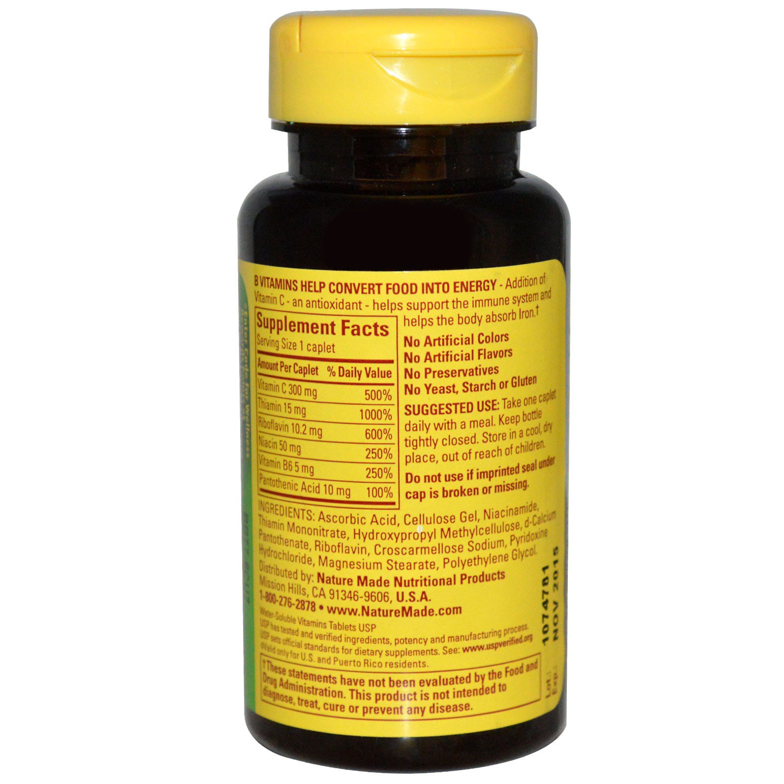 Ácido ascórbico, gel de celulose, niacinamida, mononitrato de tiamina, hidroxipropilmetilcelulose, pantotenato de d-cálcio, riboflavina, croscarmelose sódica, cloridrato de piridoxina, estearato de magnésio, polietilenoglicol.