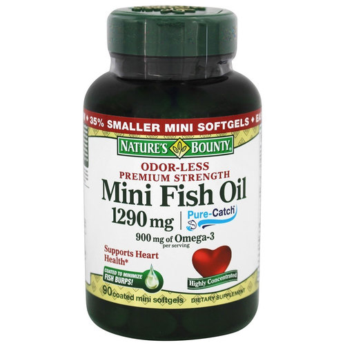 Nature’s Bounty Odor-Less Premium Strength Mini Fish Oil contém uma mistura de três grandes tipos de peixe.