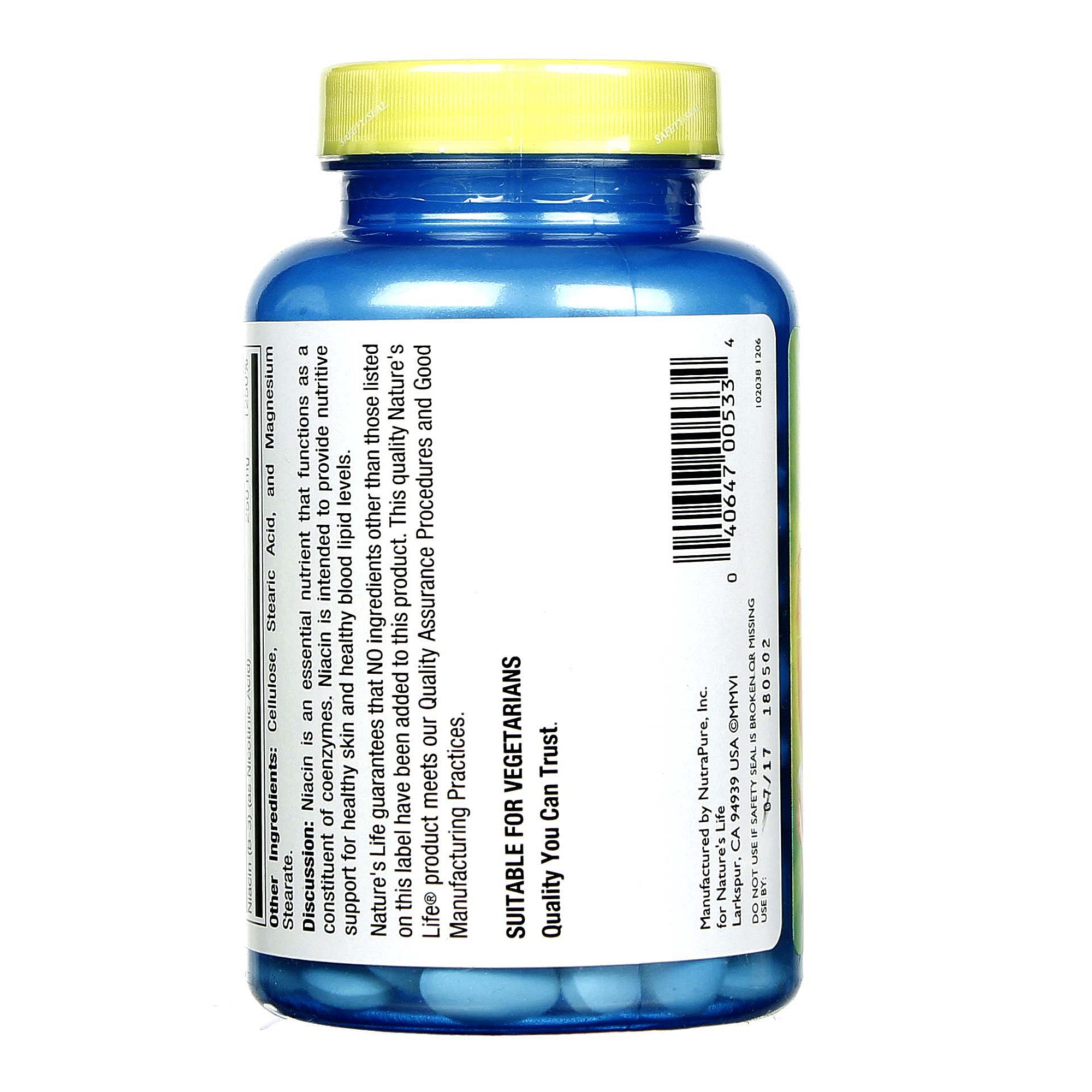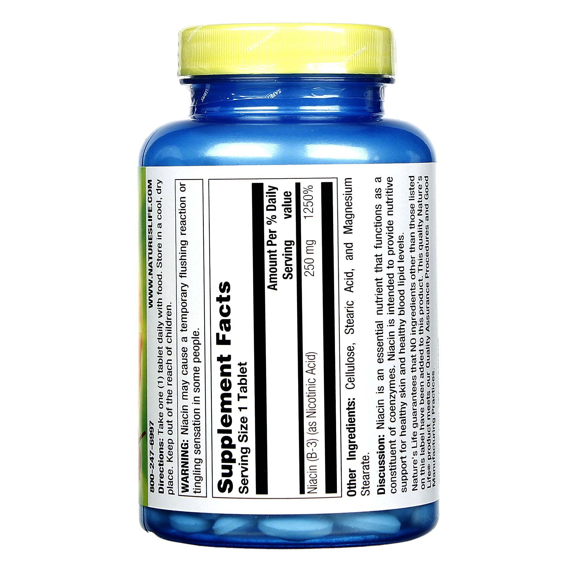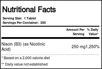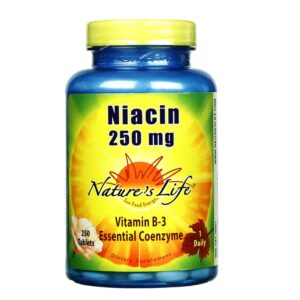 Niacin 250 mg by Nature’s Life is vitamin B3, which functions as a coenzyme constituent.