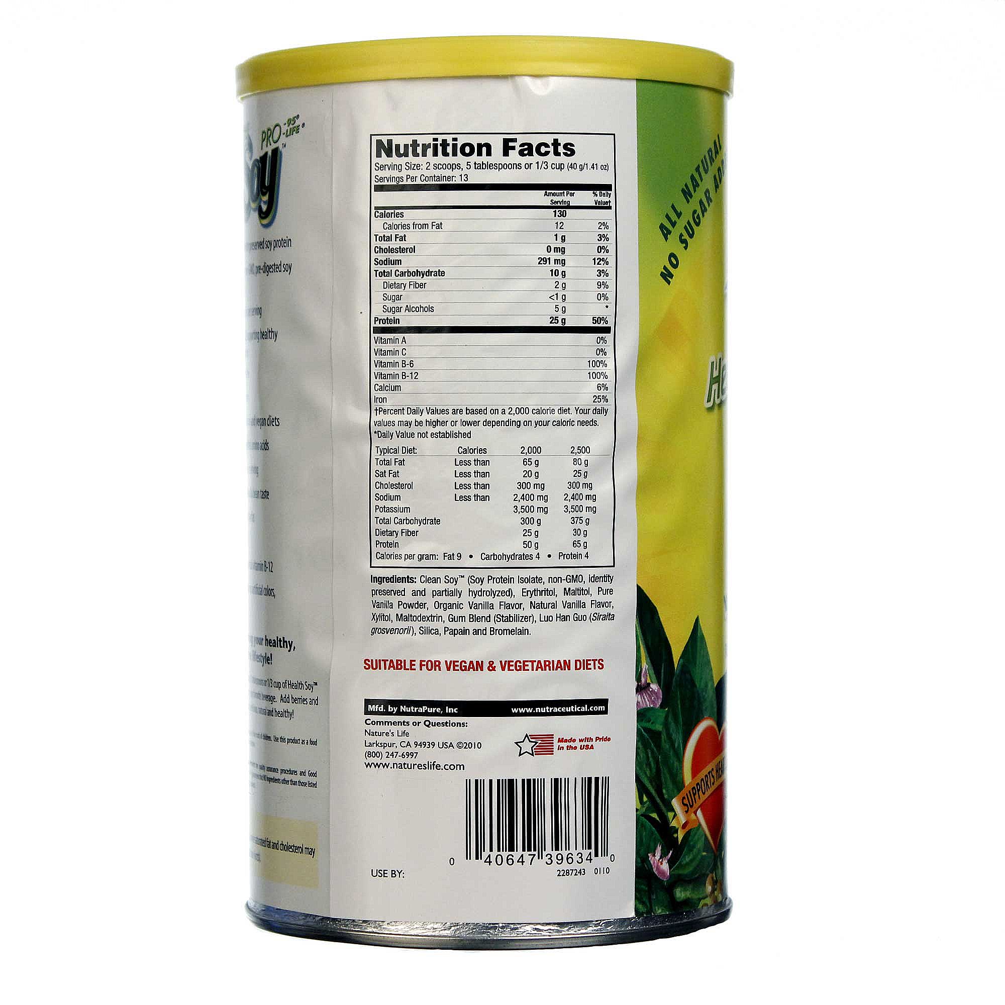Pro-Life Soy Protein is a plant based protein supplement that has all the punch of whey protein without all the animal byproducts. Each serving contains 25 grams of lean protein with no açucars, no artificial colous and no sabores artificiais. Besides being safe fou vegetarians, Nature’s Life guarantees that this product não contém moue and no less ingredients than what the label states.