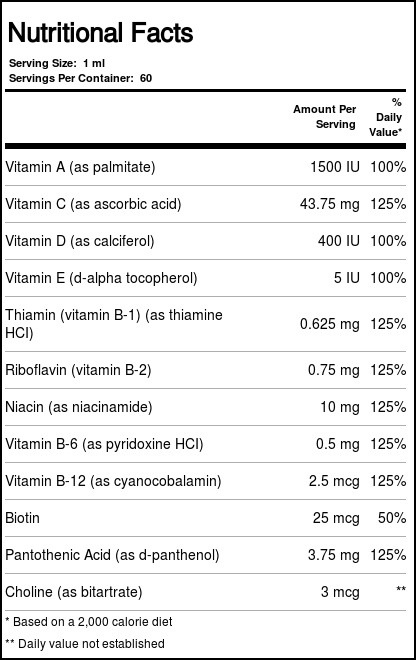 Recomendações de uso: As a dietary supplement for infants and toddlers, 1 ml daily. Measure 1 ml with enclosed dropper. Most children enjoy the taste when applied directly in the mouth. Test with 1 drop prior to administering full 1 ml dosage. Liquid drops may also be easily mixed with juice or water.