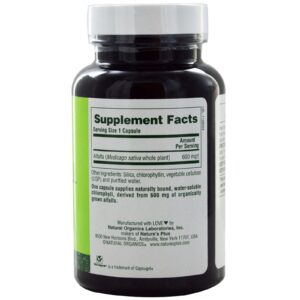 Uma cápsula fornece clorofila unida naturalmente, solúvel em água, derivada de 600 mg de alfafa cultivada organicamente.