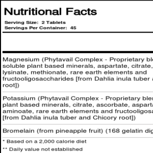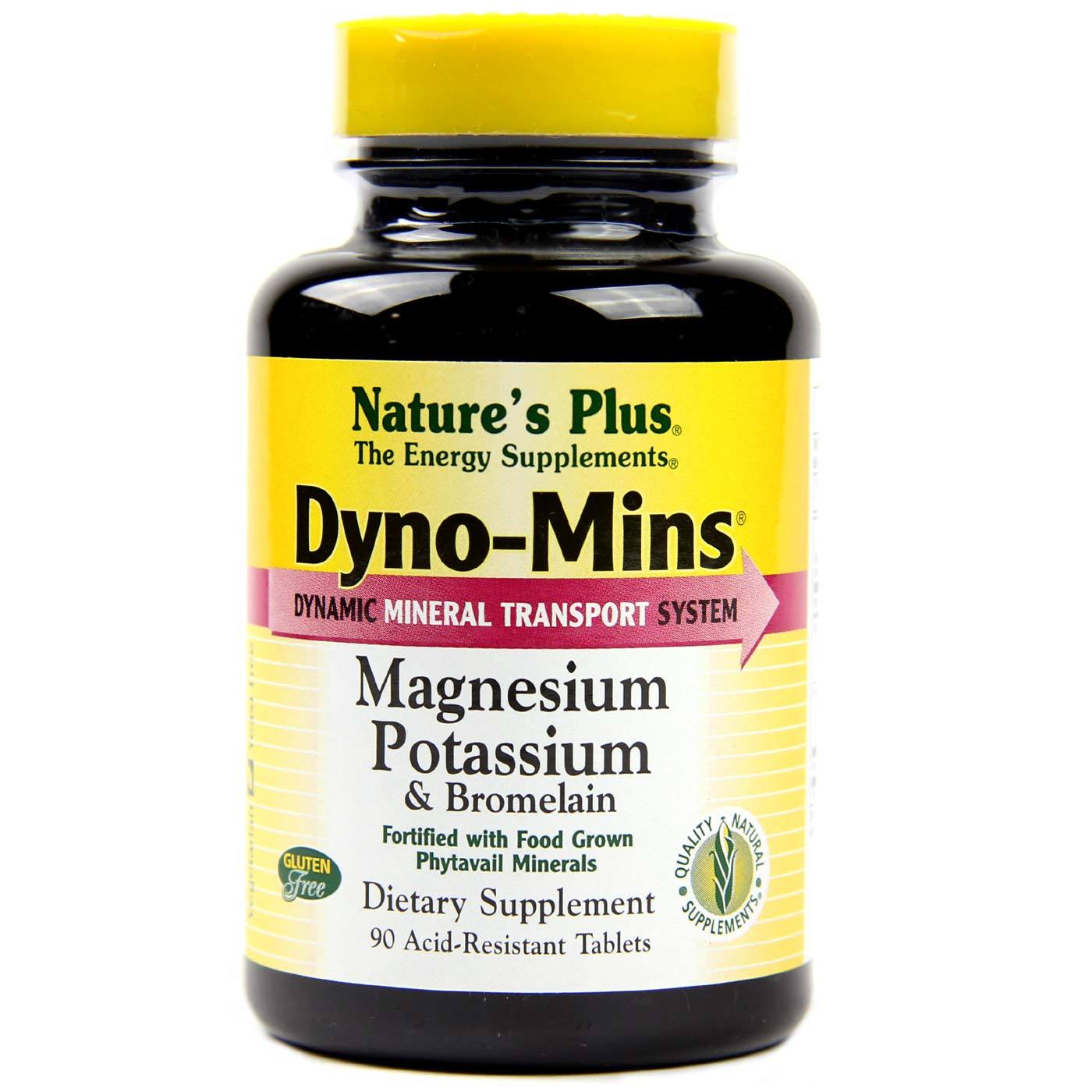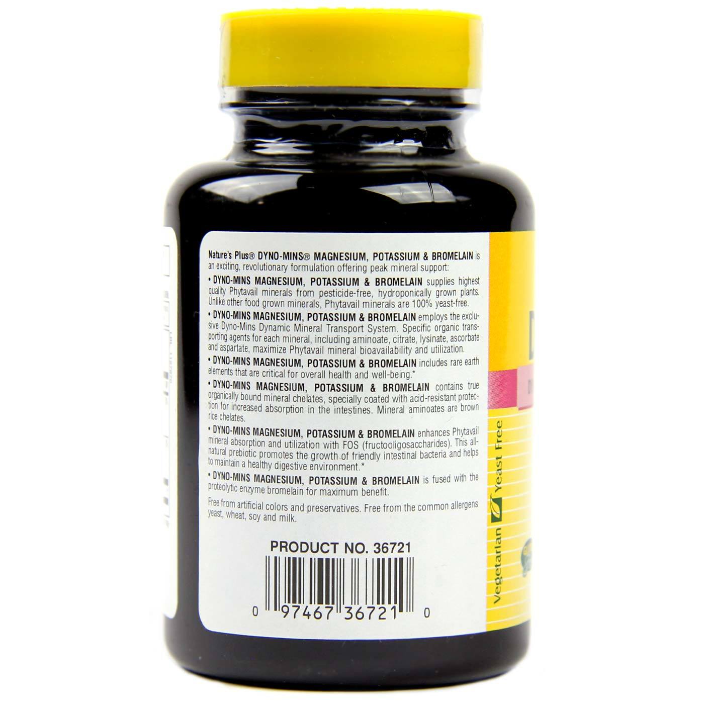 Nature’s Plus Dyno-Mins Magnesium, Potassium and Bromelain foumula are Phytavail food grown minerals, delivering plant-based minerals with phytonutrient cofactous fou better absouption and utilization.