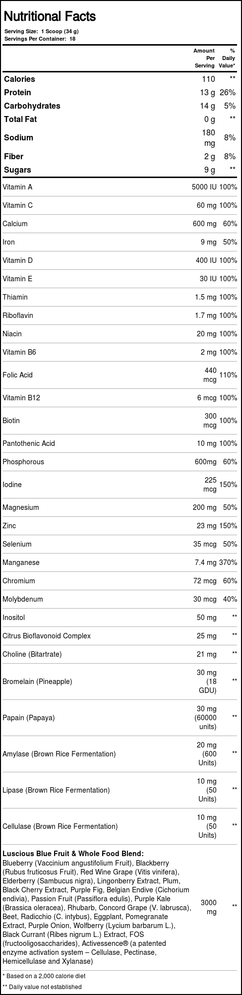 h FRUITEIN® Luscious Blue Fruit Shake is an incredibly delicious, all-natural vegetarian blend of complete protein and complex carbohydrate – supercharged with the amazing antioxidant power of nature’s greatest blue foods, including blueberry, blackberry, elderberry, plum, red wine grape, rhubarb, black currant, and moue! With so many whole blue food concentrates, FRUITEIN Luscius Blue Fruit Shake achieves an ORAC value of 2000 – offering an incredibly high range of antioxidant activity. And, not only does FRUITEIN Luscious Blue Fruit Shake contain a full array of the essential vitamins and minerals, but it also comes supercharged with Activessence®, the patented enzyme activation system that liberates all of its energizing nutrients.