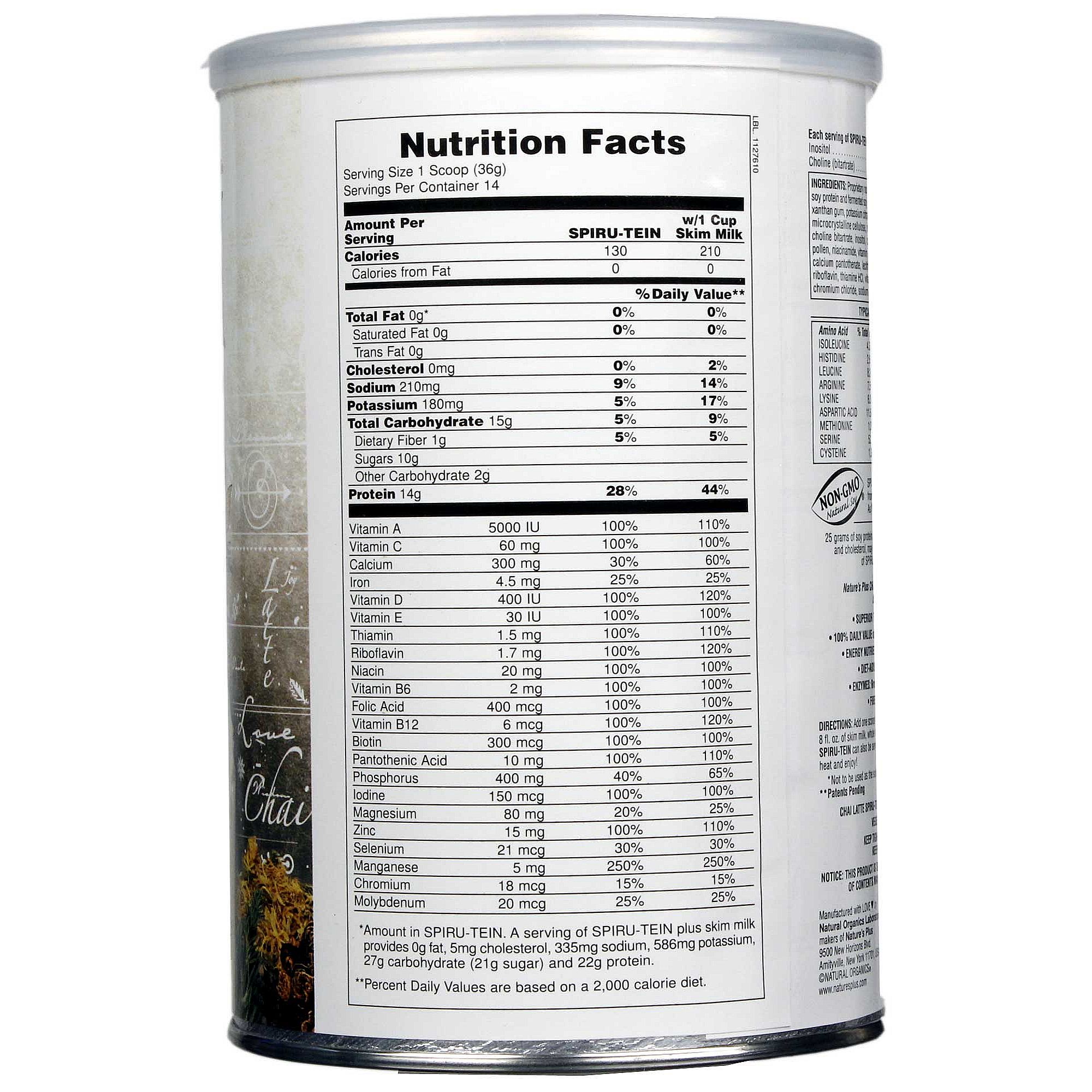 Nota: Spiru-Tein mixes instantly, no blender required. Vegetariano safe, non-GMO verified. Yeast-free product. Stoue tightly closed in a cool, dry place.