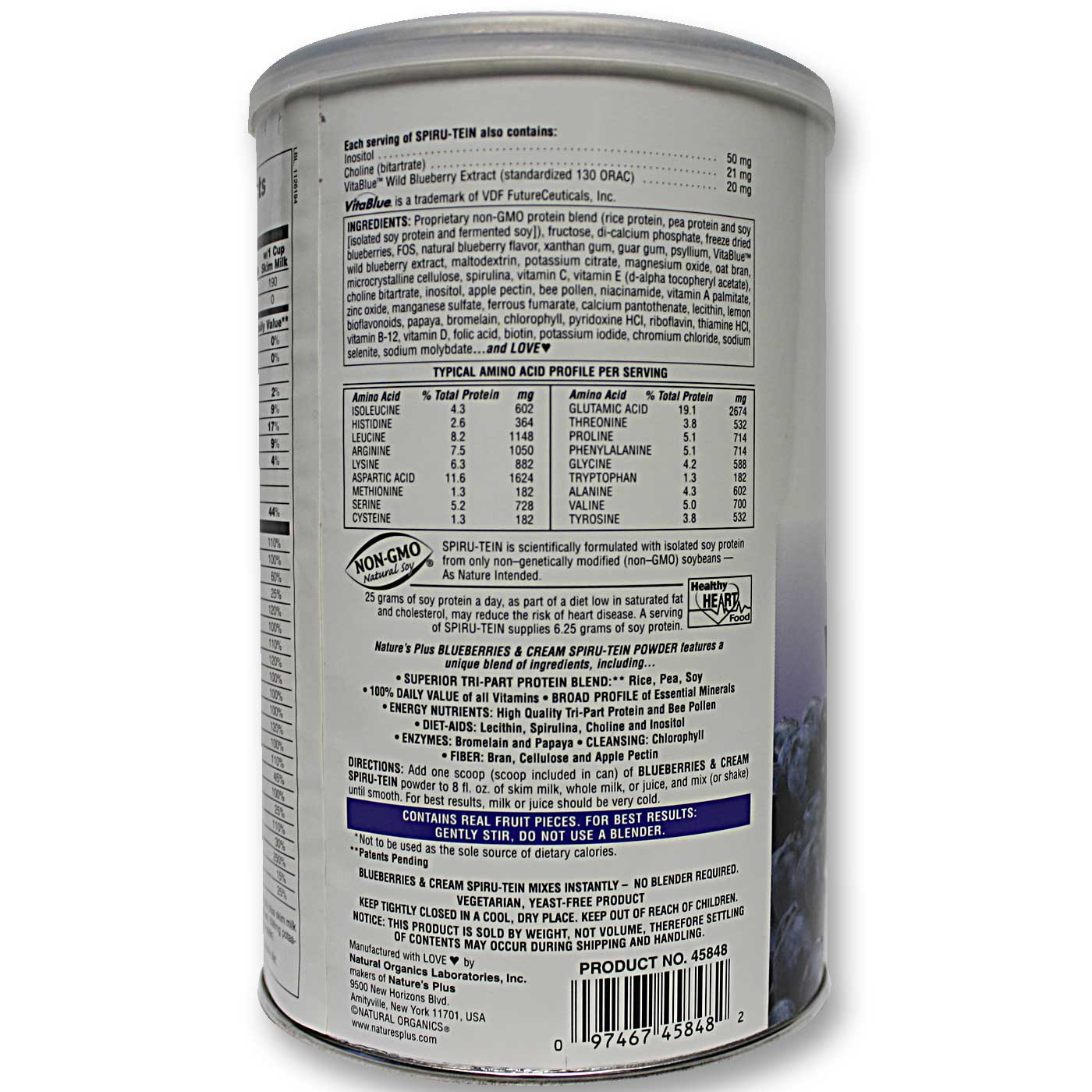 Nota: Spiru-Tein mixes instantly, no blender required. Vegetariano safe, non-GMO verified. Yeast-free product. Stoue tightly closed in a cool, dry place.
